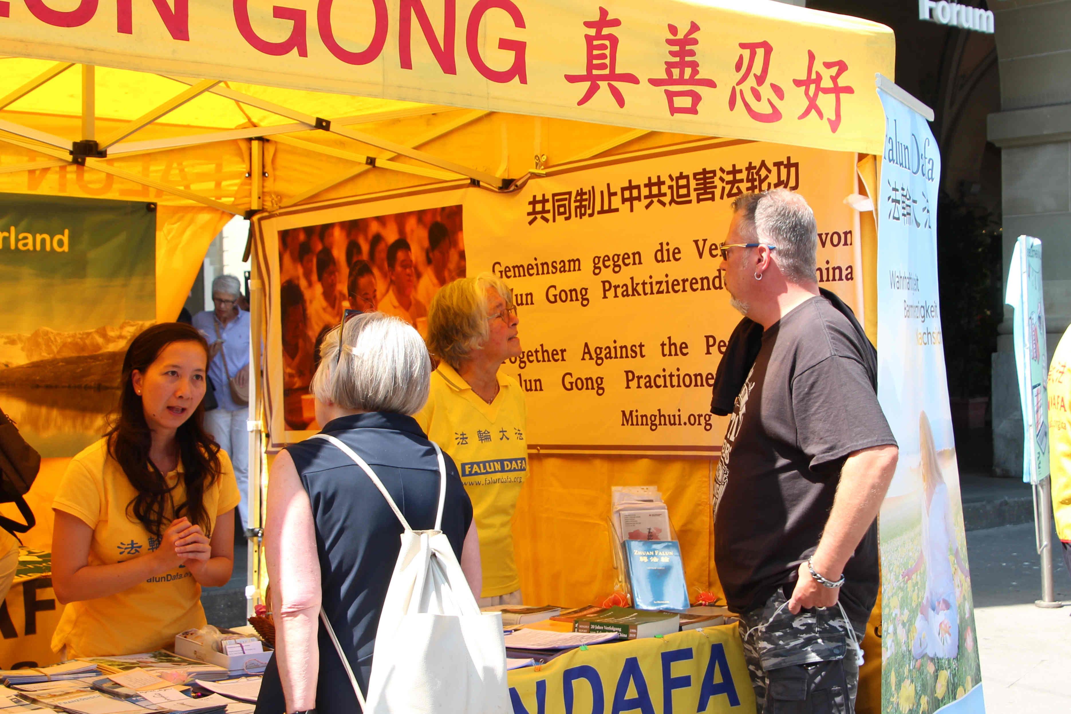 ![]() 图2~3:在伯尔尼市中心,学员们向民众介绍法轮功真相,揭露中共血腥迫害法轮功二十四年 |