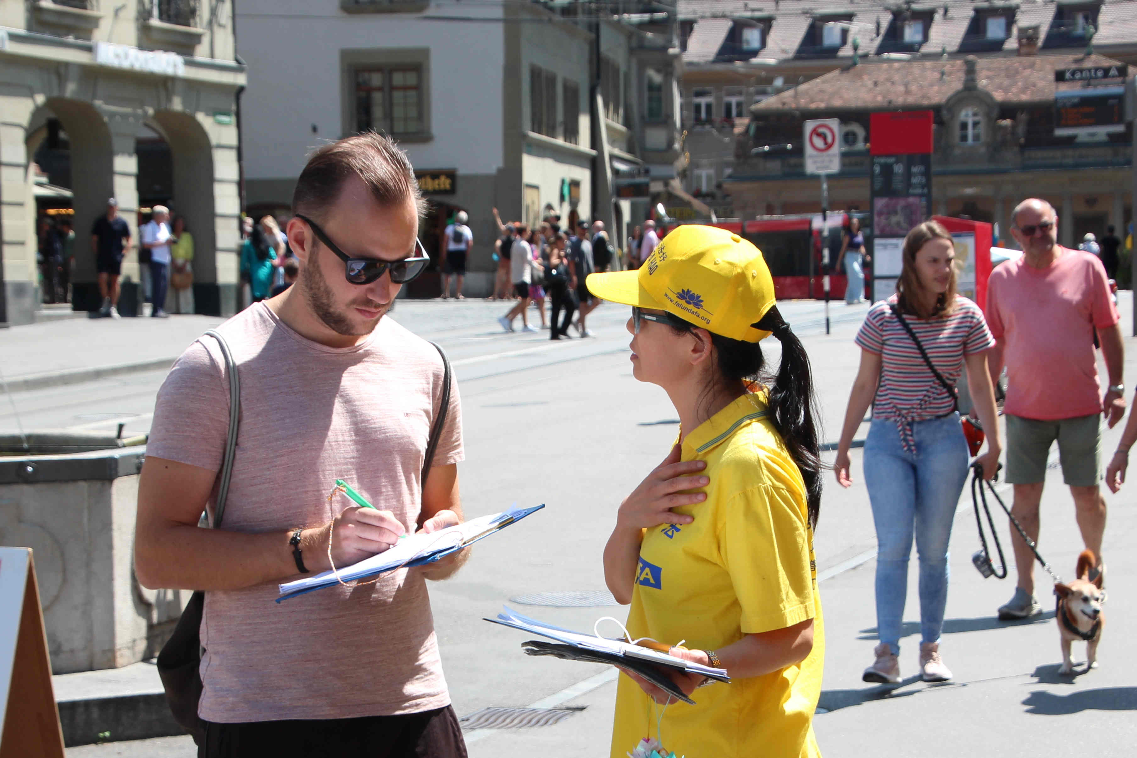 同样是在咖啡店室外座享用美食的皮耶丽娜·雷米(Pierina Raemy)和她的朋友,看着学员们平静地做着舒展的动作,聆听着学员们播放的演讲后,她们主动过来向发送资料的学员询问征签表。仔细阅读后,她们签上了自己的名字,并继续阅读得到的法轮功资料。