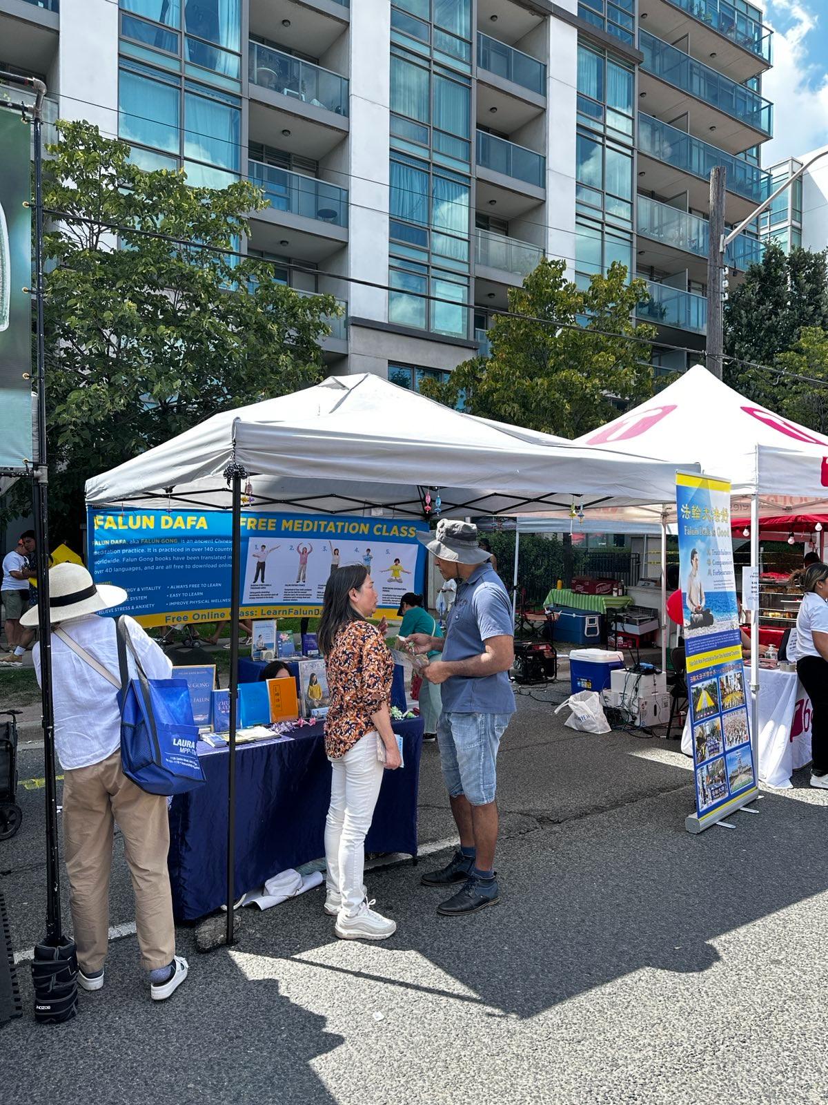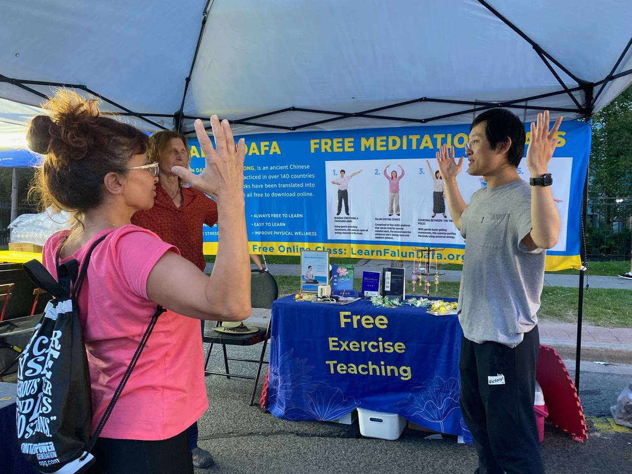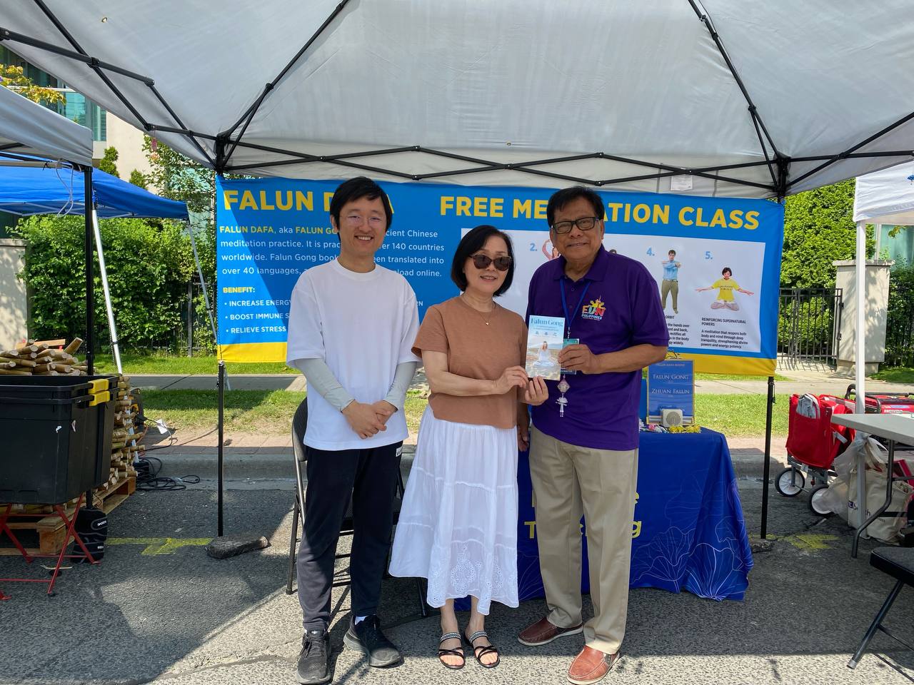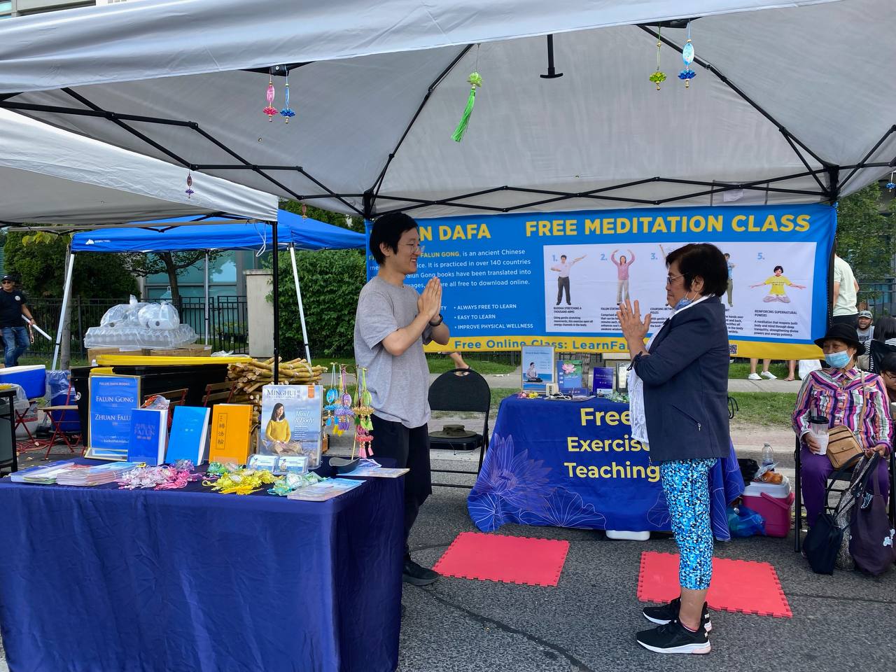 今年的活动,来展位学功的人比以往更多。人们来到法轮功展位前阅读展板内容,拿着介绍大法的传单听学员介绍,并索要挂着“法轮大法好,真善忍好”卡片的小莲花。参加活动的人们告诉学员,他们之前在公园看到过炼功的学员,还在路边阅读过介绍法轮大法的展板,当时就有关注。今天看到法轮功学员的展位,正好来了解、学炼功法。学功后,人们立刻感到身体很舒缓。