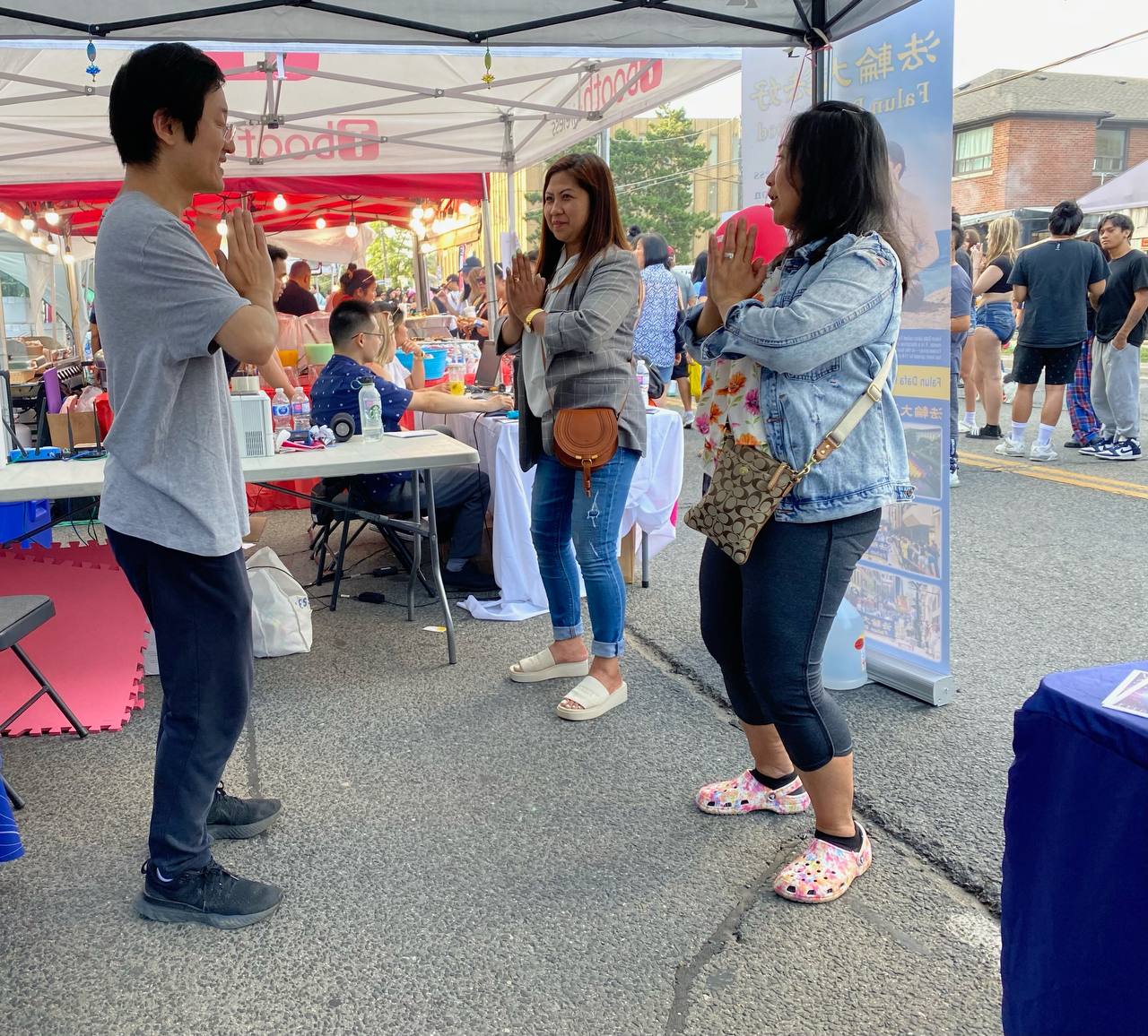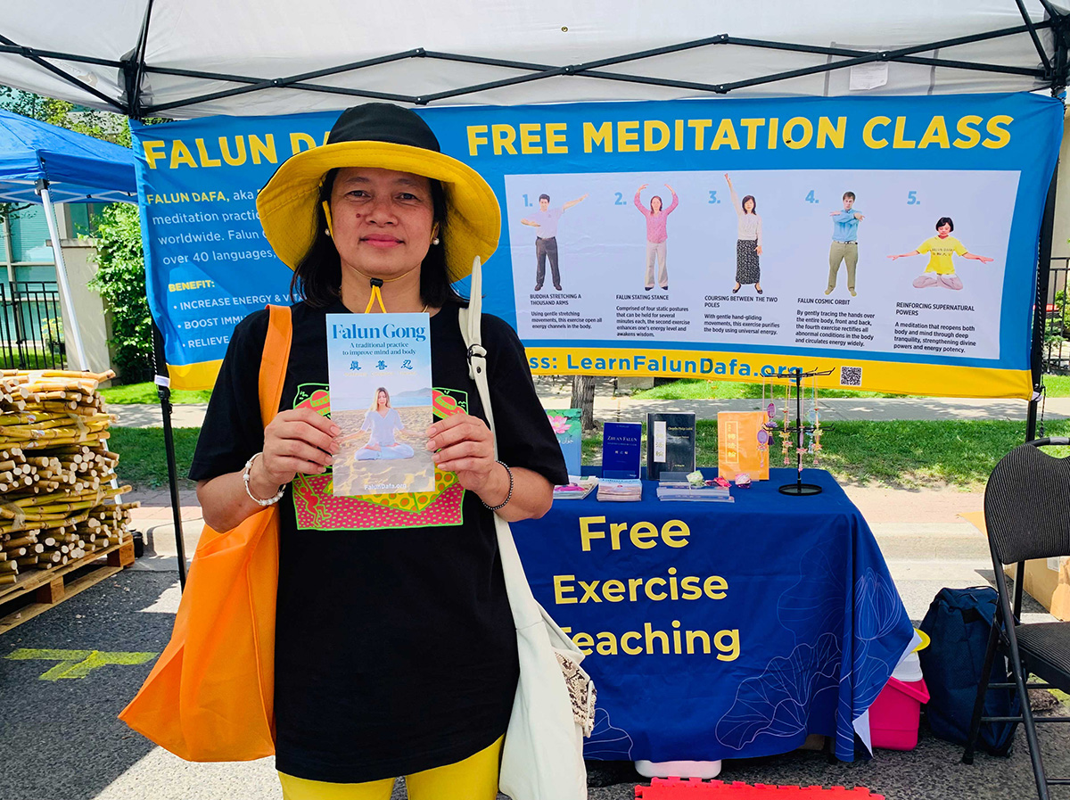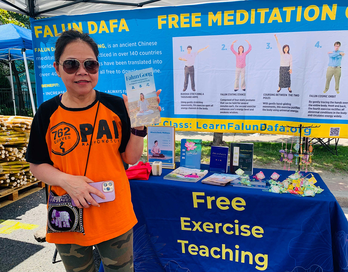 辛迪(Cindy)来自泰国。她去唐人街时,看到过法轮功的真相点,也上网了解过功法。来到展位,她停留了很长的时间,认真学习了动功和静功的动作。
