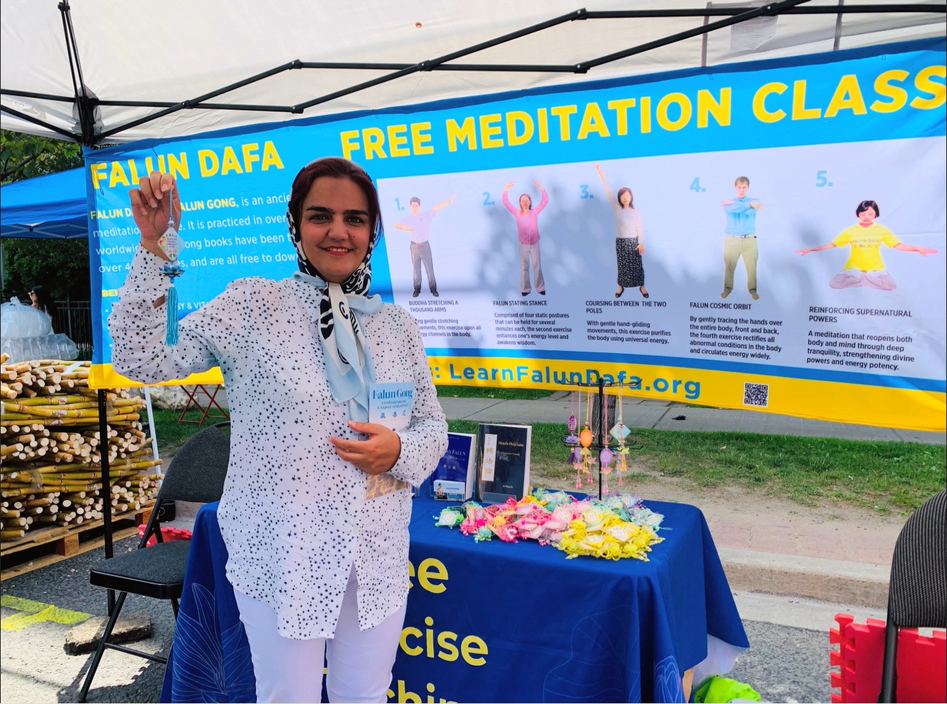 阿特塞(Ateseh)是来多伦多旅游的游客。她表示,“虽然第一次听说法轮功,但看到展位后就想过来学功。”在展位上,阿特塞学炼了第一至五套功法。