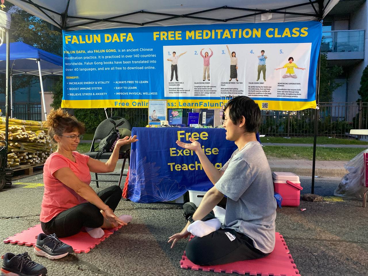 傍晚,骑着自行车的拉多斯蒂纳(Radostina)看到法轮功展位上,学员正在教一位女士炼功动作。她停好自行车,也要过来学。她跟着学员炼了一至五套的全部功法。