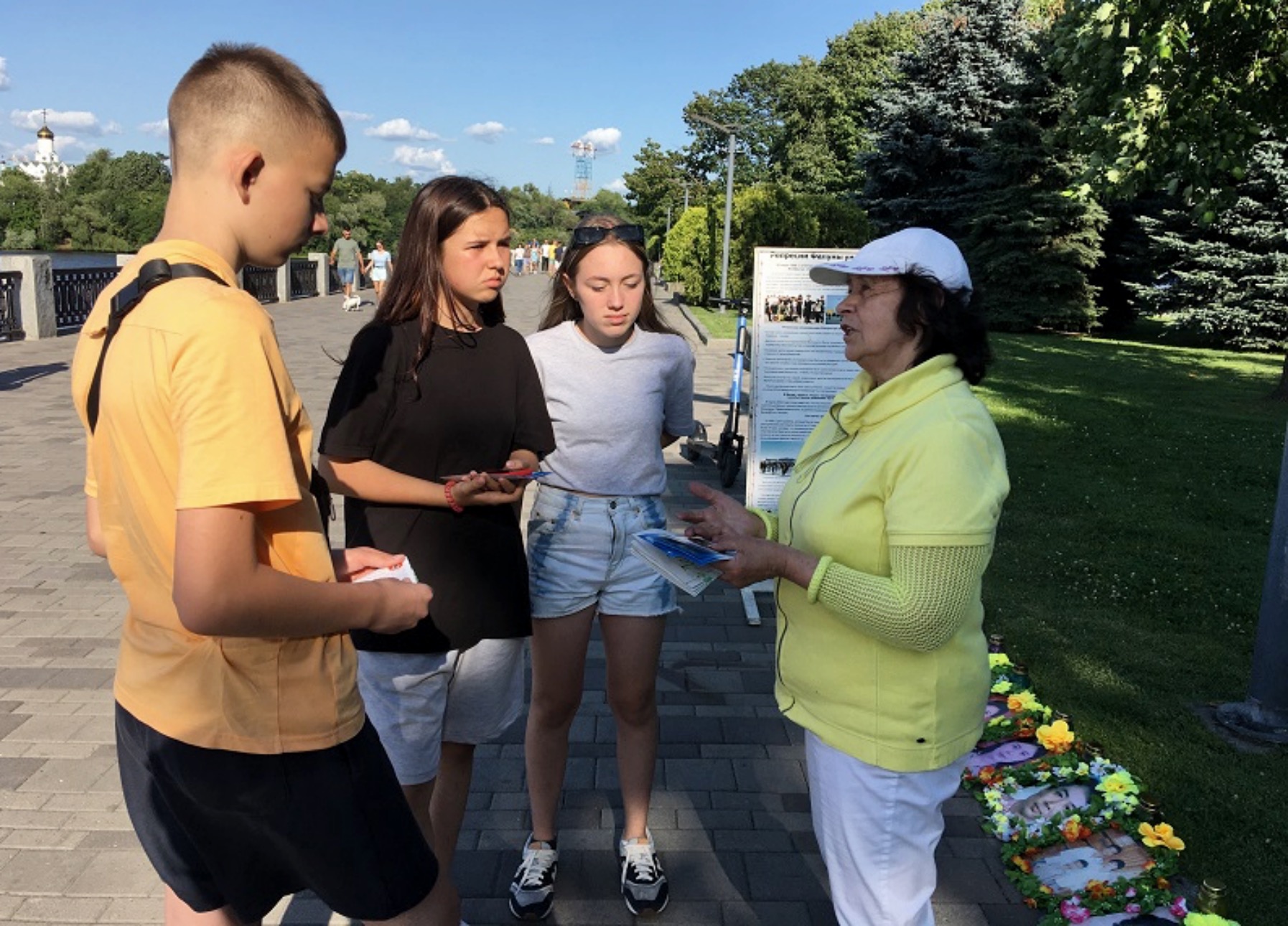 图1~2:二零二三年七月十六日,法轮功学员在第聂伯罗河堤上集体炼功,向人们介绍法轮功。