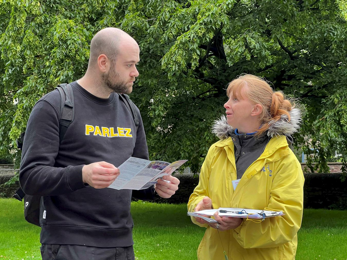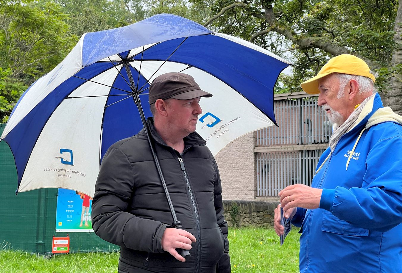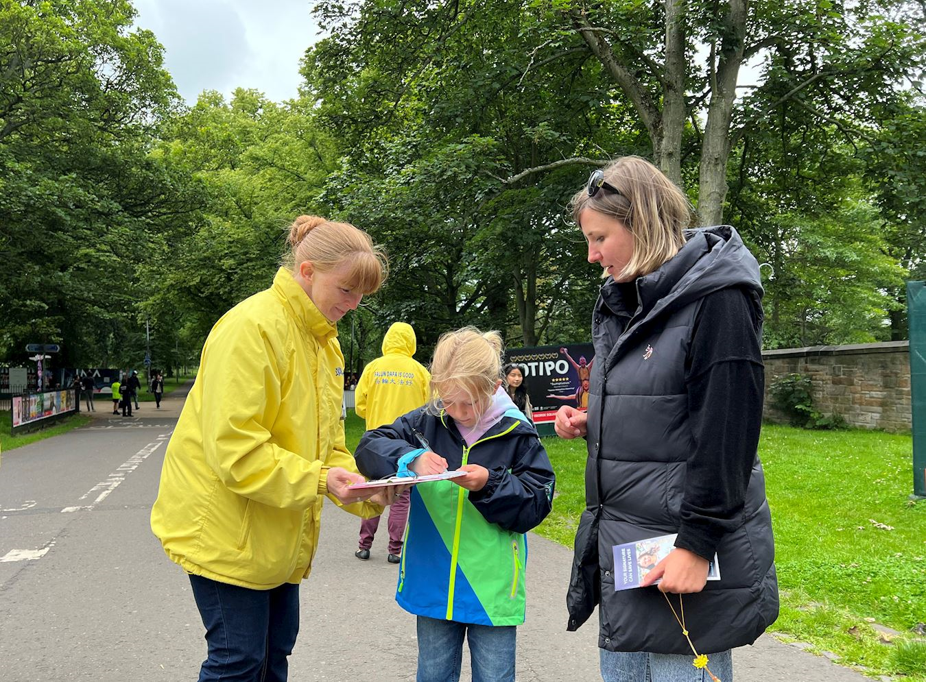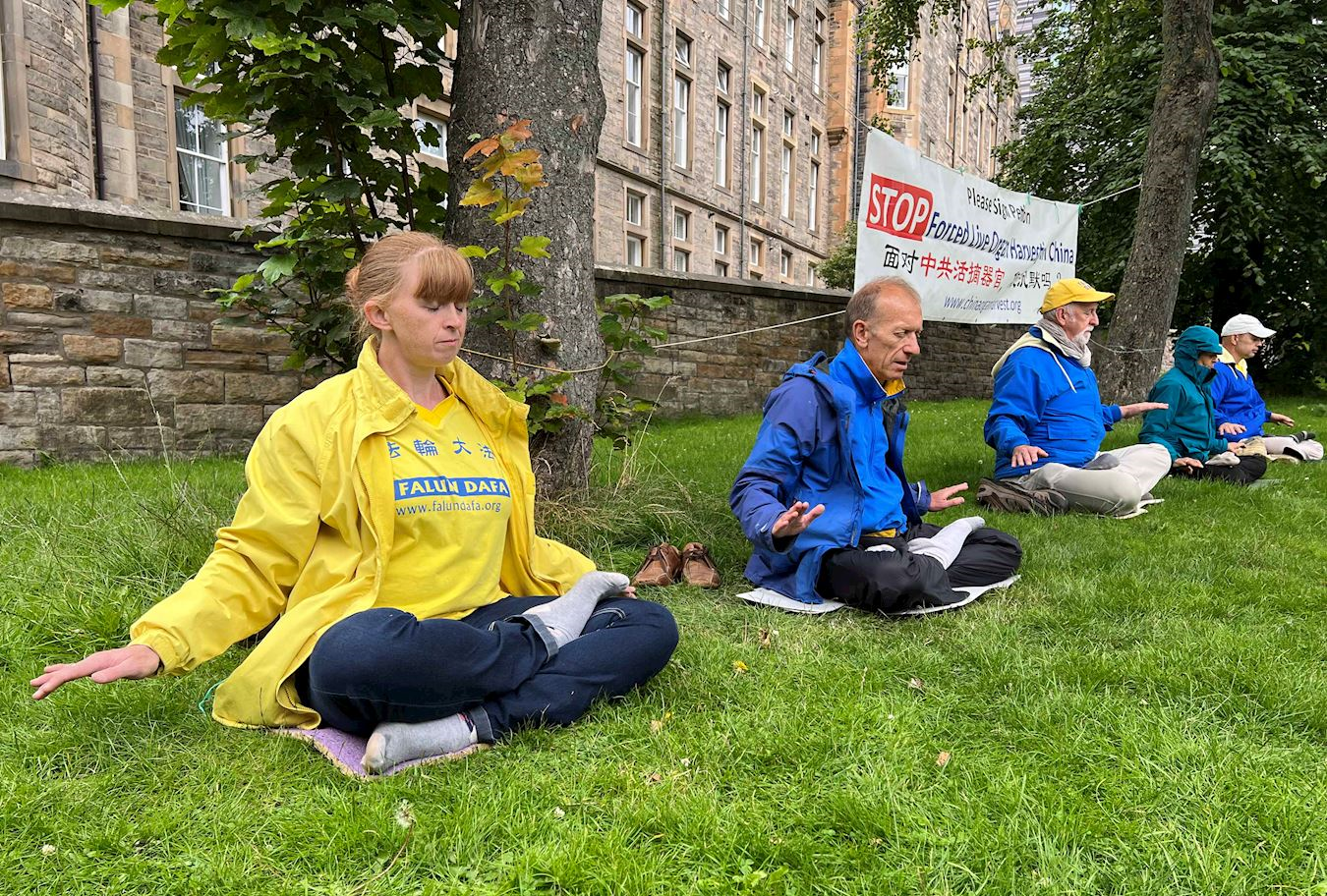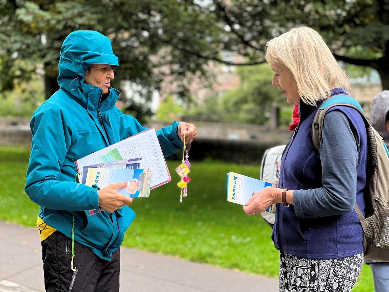 学员将展位设立在爱丁堡最大的麦道斯公园(Meadows Park)入口处,“法轮大法好”、“停止活摘法轮功学员器官”等横幅和展板清晰地传递出反迫害的信息。细雨中,学员演示着五套祥和的功法,平静祥和,吸引着络绎不绝的行人。