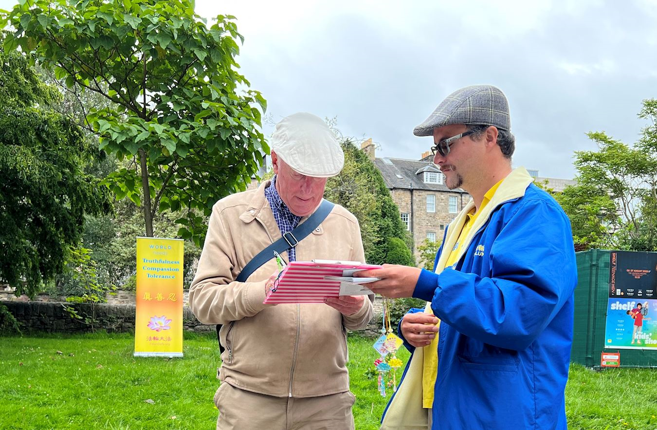 一位退休的公司业主也是第一次听说法轮功,及中国大陆法轮功学员所遭受的迫害。学员向他解释说:因为中共宣扬无神论,所以它迫害信仰神的人,包括维吾尔族穆斯林、藏族佛教徒和家庭教会基督徒。他相当震惊于中共活摘器官的罪行。得知伦敦中国独立法庭已根据调查事实做出判决后,他感谢学员提供这样的信息,他说将上网阅读相关内容,并告诉更多人来了解法轮功真相。