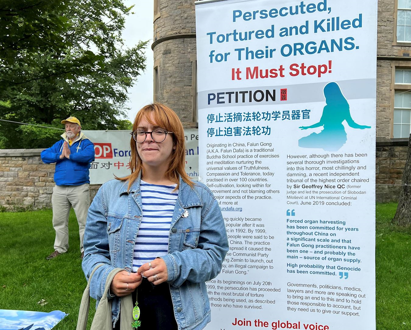 莎朗(Sharon)是一名护士,她与朋友在马路对面,看到“停止活摘法轮功学员器官”的展板时就被震惊到了,于是,她和朋友一起过来阅读展板。当她得知在中国做器官移植有时只需等待几周时,因为中共有“活人器官库”,她反复强调:“这太可怕了,它不应该发生。”她主动要求为学员签名,帮助制止迫害。