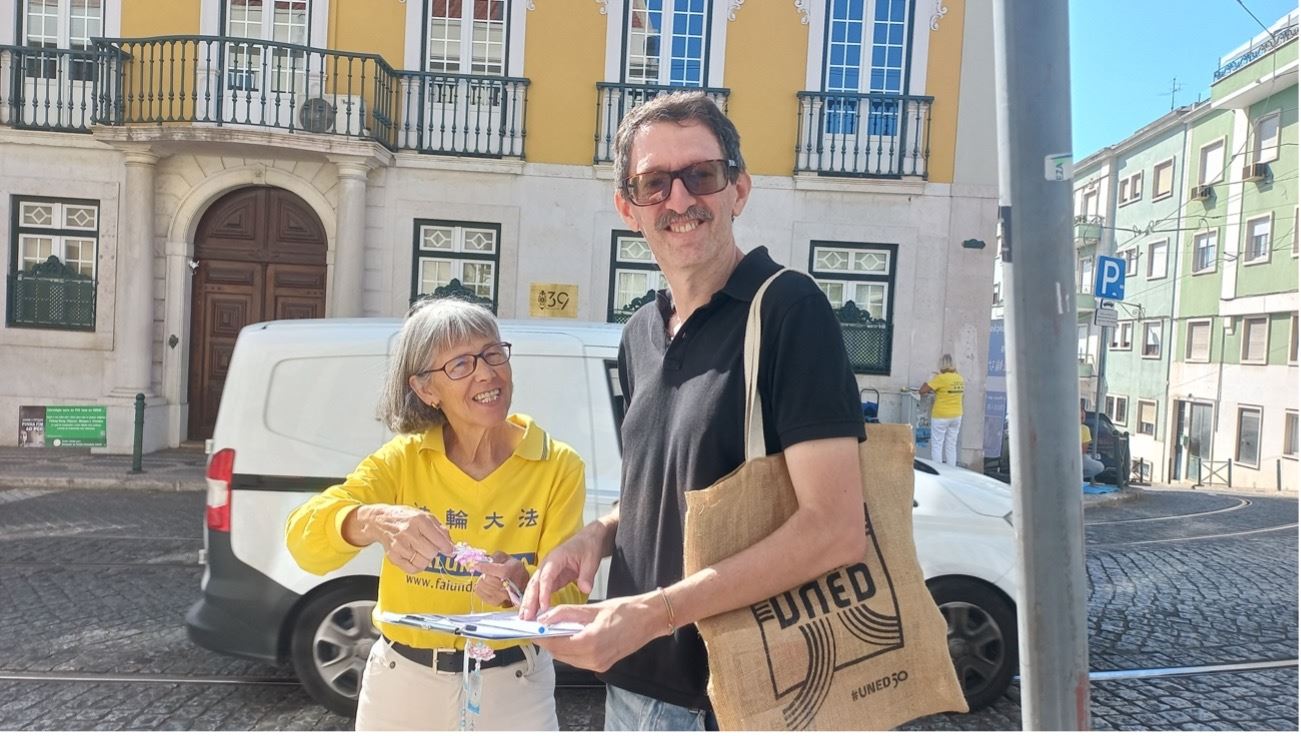 西班牙人何塞·桑切斯(José Sánchez)从街上经过,他也很清楚中共对法轮大法修炼者们做了什么,他马上在请愿书上签名支持法轮功学员反迫害。