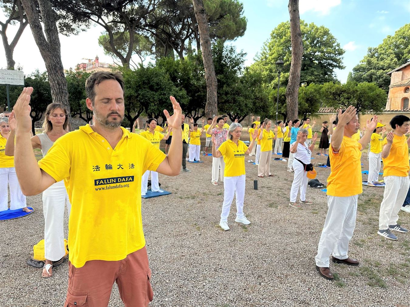 二零二三年七月二十二日上午,法轮功学员在橘子公园集体炼功,此地坐落在罗马市中心的一处丘陵上,从这里可以俯视罗马,台伯河静谧地从山脚下流淌而过,古城景致尽收眼底,优美的炼功音乐和学员平和的炼功状态吸引着来此观光的游客,向他们展示着大法的美好。