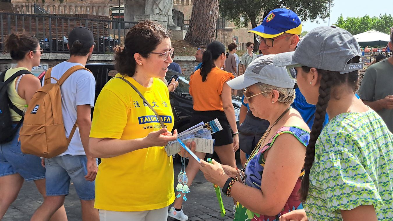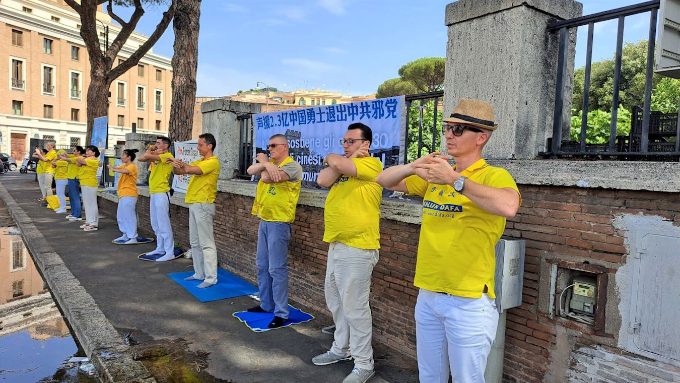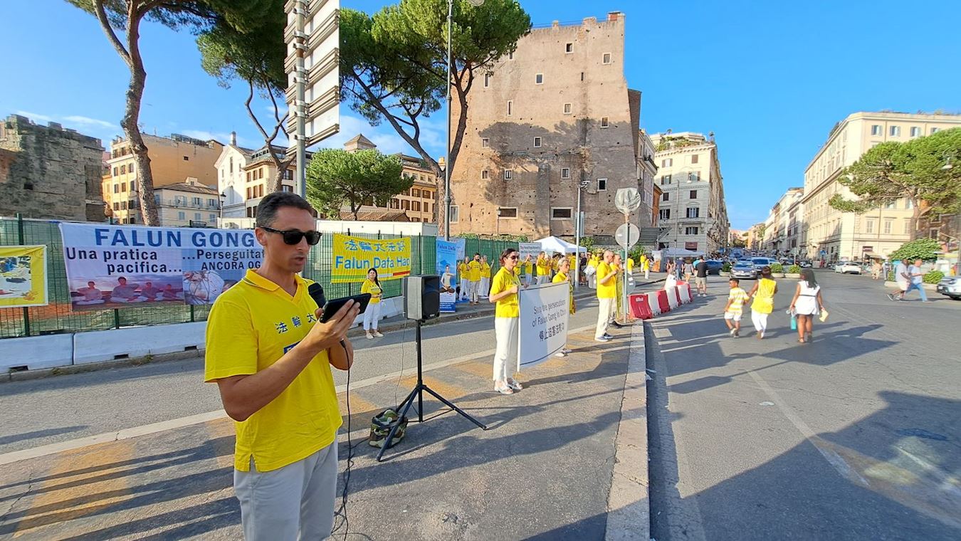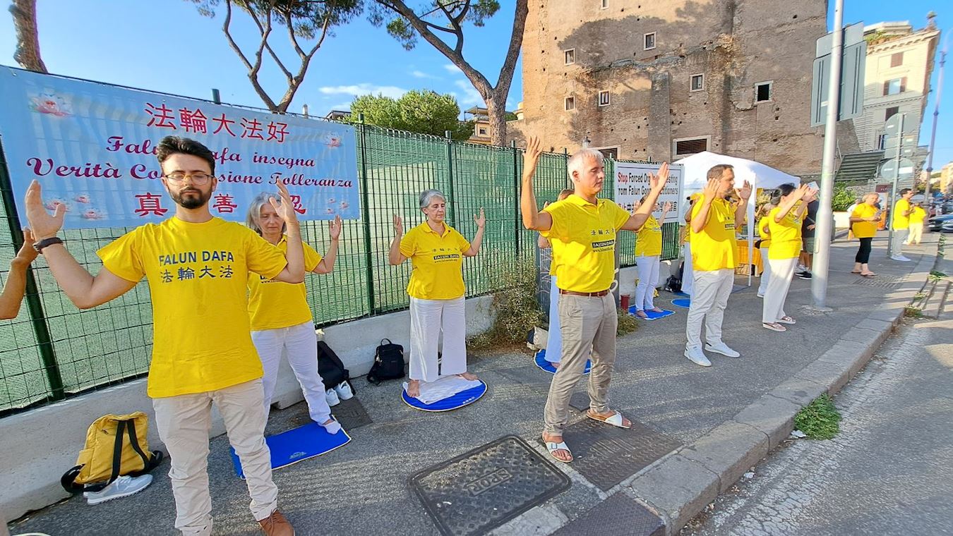当天下午至傍晚,在罗马著名的、连接古罗马斗兽场和威尼斯广场的帝国广场大道(Via dei fori imperiali),法轮功学员集体炼功,并告诉人们法轮功是什么,以及中共残酷迫害法轮功,活摘法轮功学员器官牟利的罪行。过往行人中有的用手机拍照,有的停在真相展板前仔细阅读真相图片。