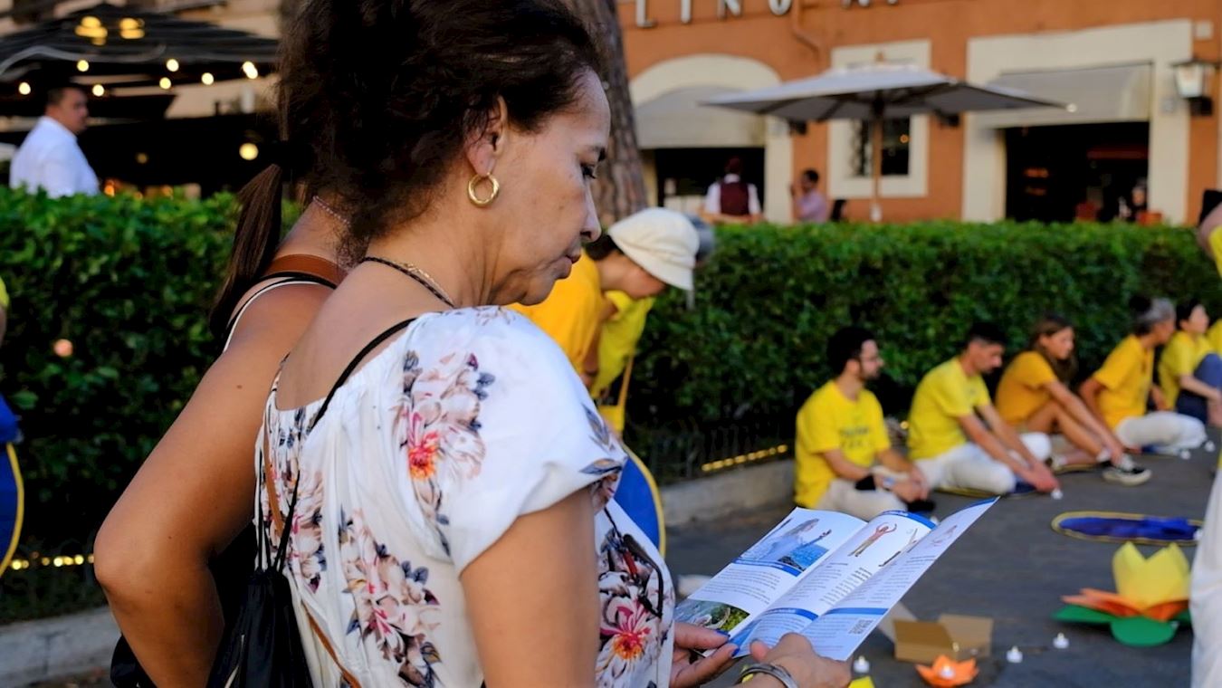 一位讲西班牙语的女游客,驻足观看学员的烛光悼念活动。她认真阅读了真相传单后说:“当今世界上还有这样残忍的事情发生着,真是让人震惊。就应该把这种恶行公布于众。”
