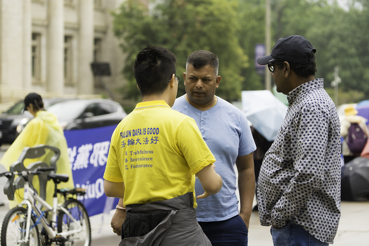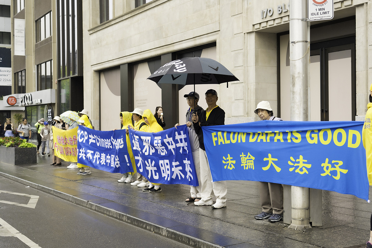 当日细雨淅沥,凉风习习。来往的路人不顾风雨,停下脚步阅读横幅上的标语,跟法轮功学员交谈,并签名声援中国人退出中共。