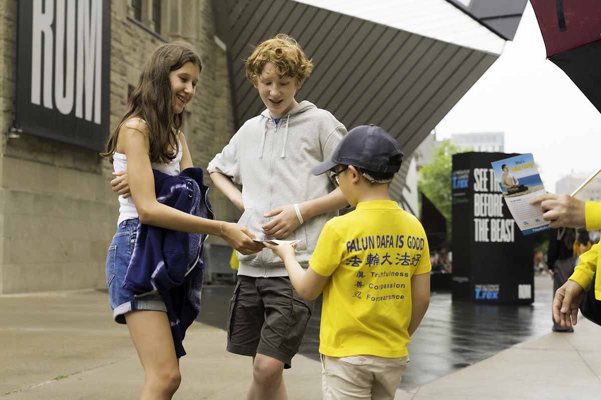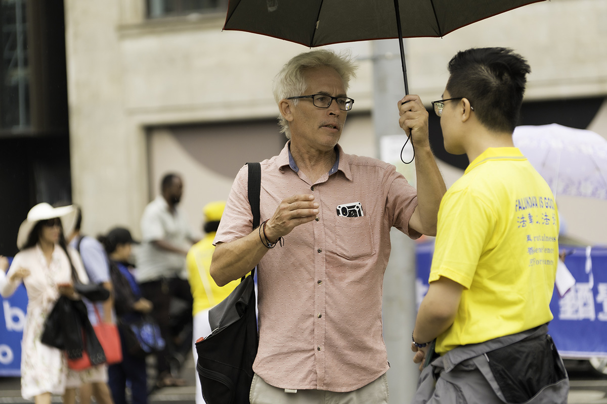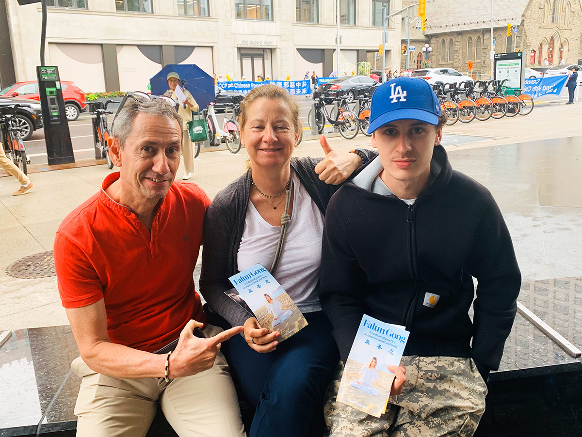 雷内(Rene)是法国人,来加拿大蒙特利尔读书。他带父母来多伦多游玩,正好看到了法轮功学员在市中心的街道上举办横幅展。