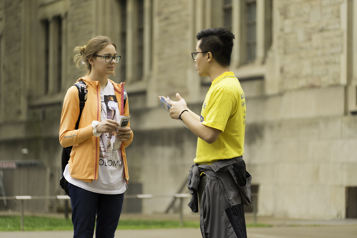 学员向他递过了传单,他喃喃念了两遍“法轮大法”,然后说,“我也有打坐的习惯。我会去网上查。”