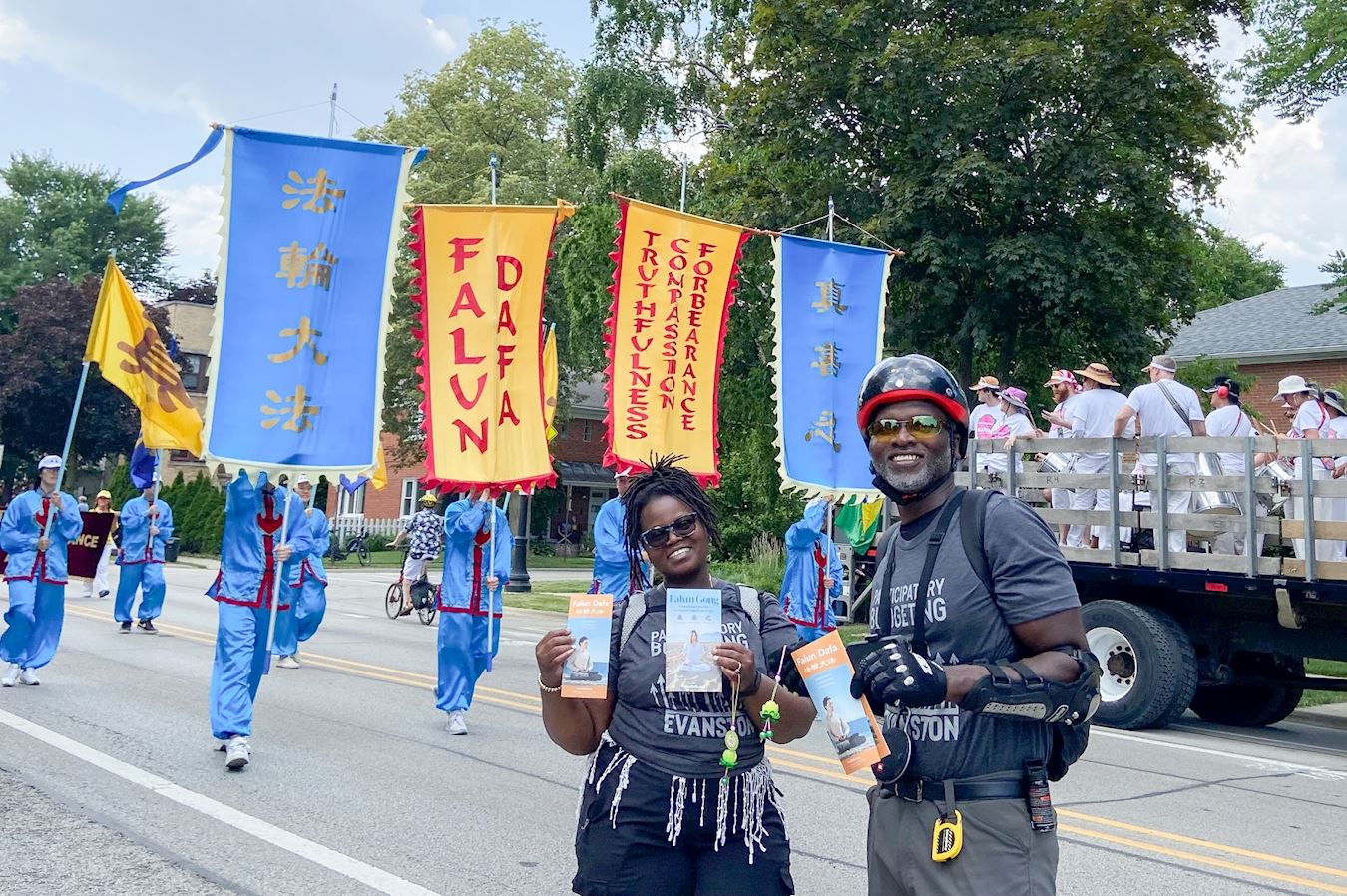 克里斯蒂娜(Christina)和凯文(Kevin)都是埃文斯顿市参与市预算委员会的义务工作者。他们在看到法轮功团体迎风飘展的旗阵时非常兴奋。