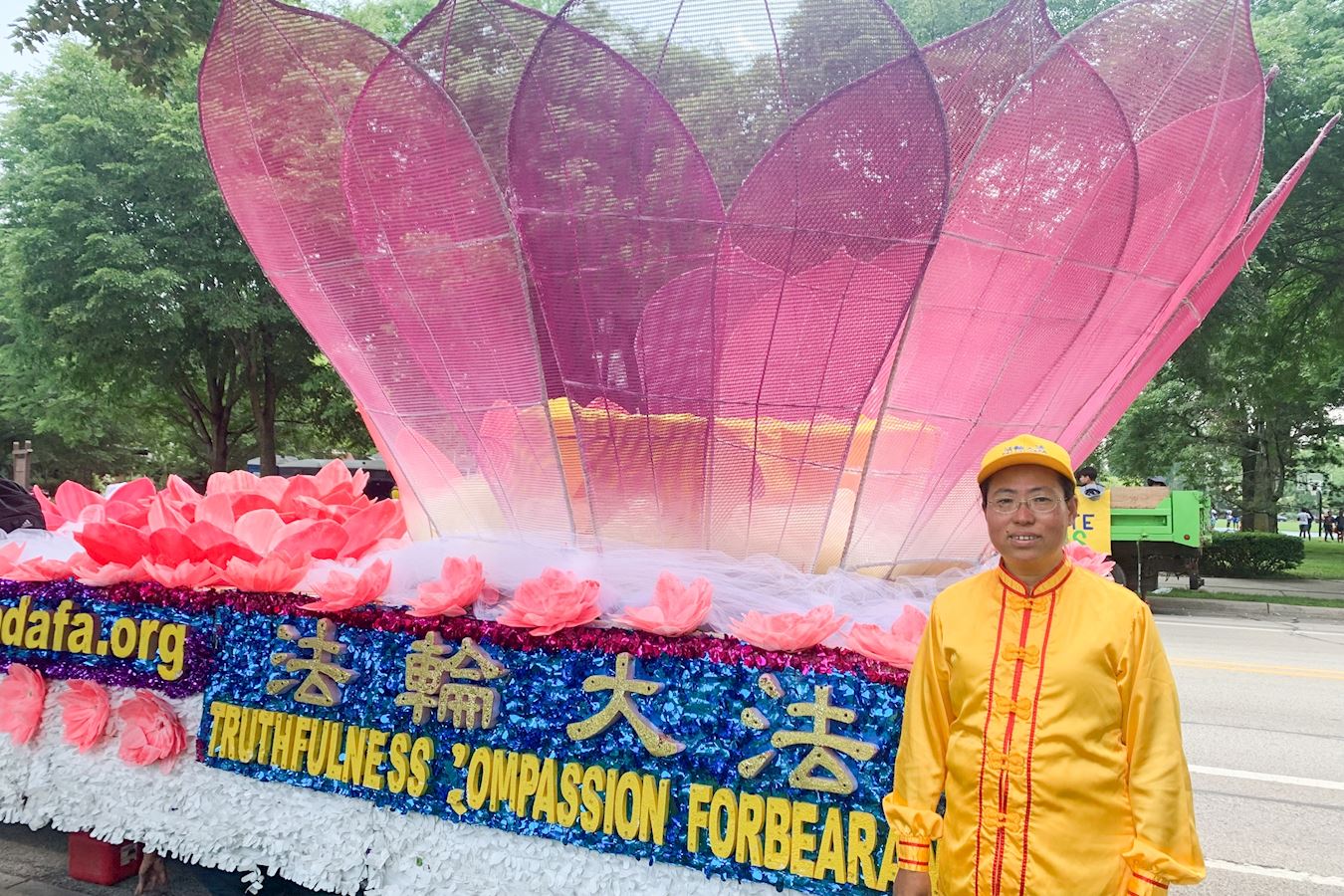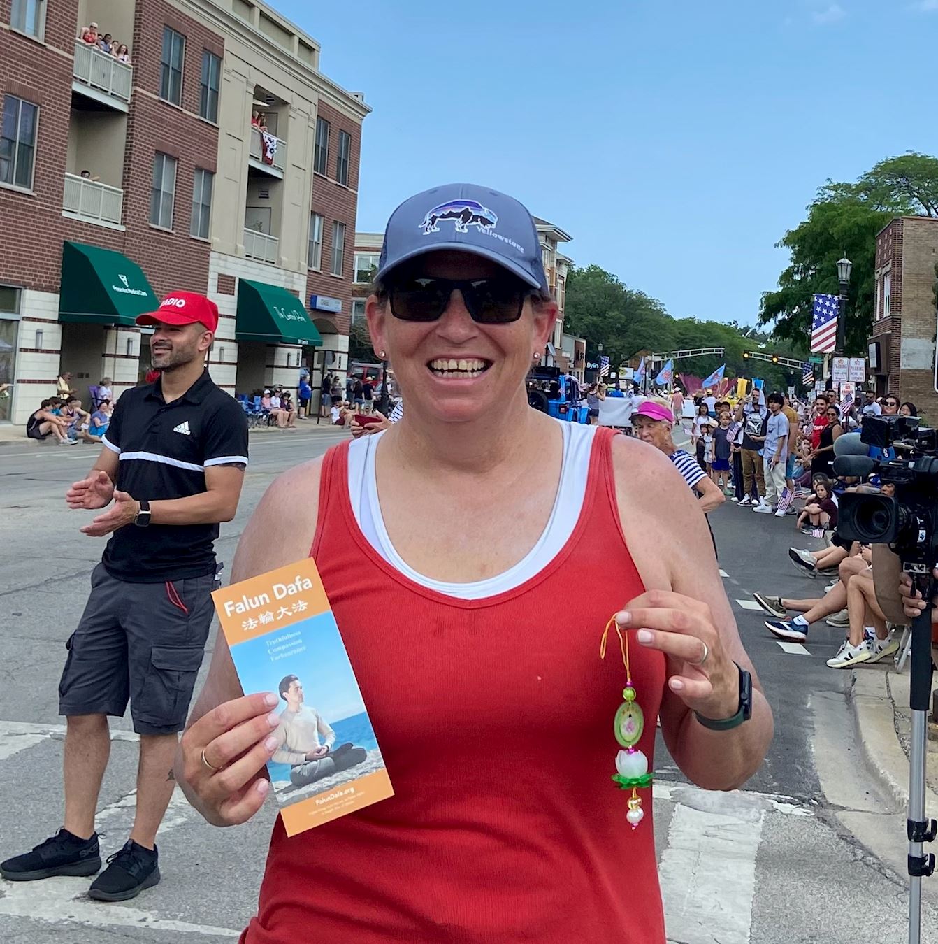 埃文斯顿居民安·库珀(Ann Cooper)很高兴看到法轮大法学员的花车,“真、善、忍”三个字吸引了她。她非常感谢能得到莲花和法轮大法的真相。她相信学习真、善、忍可以让人精力充沛、注意力集中,所以非常好。她表示迫不及待地想学习这个功法。