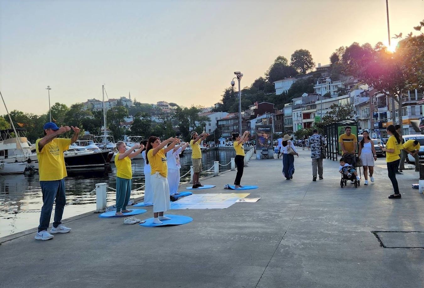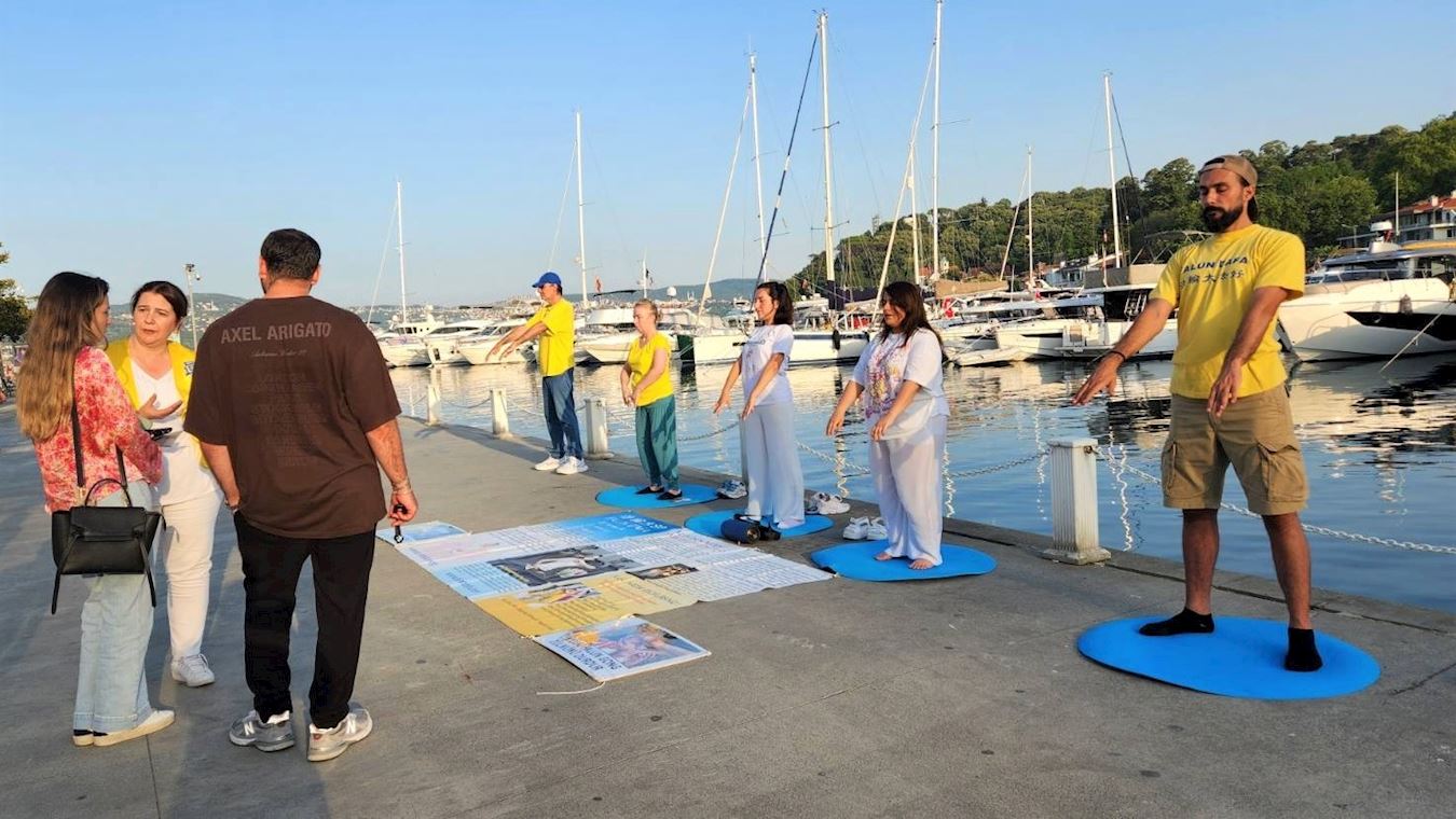 ![]() 图1~2:二零二三年七月二十二日,法轮功学员在伊斯坦布尔中领馆前的海滩上现场演示功法。许多市民及游客询问学员想了解更多关于法轮功的信息。 |