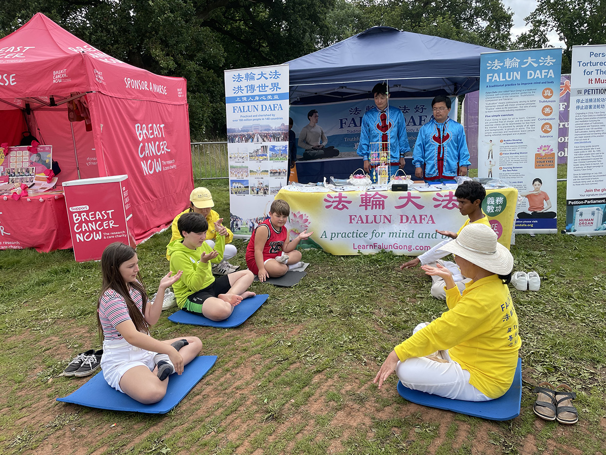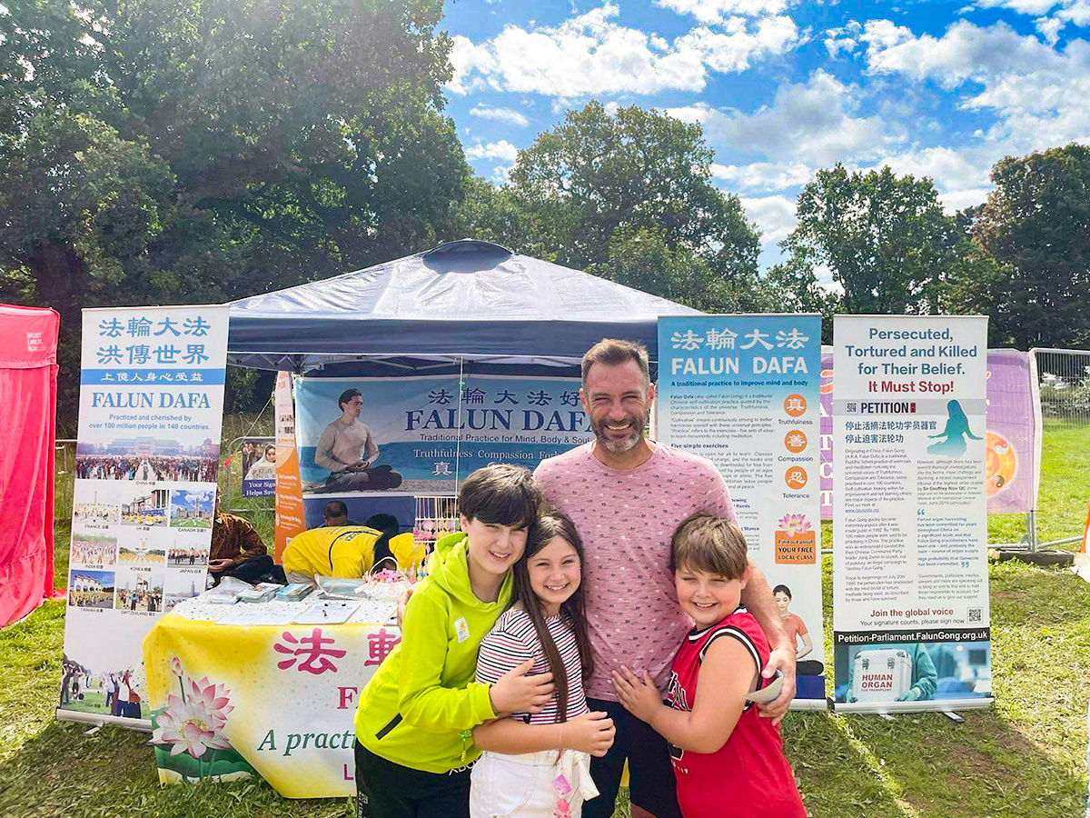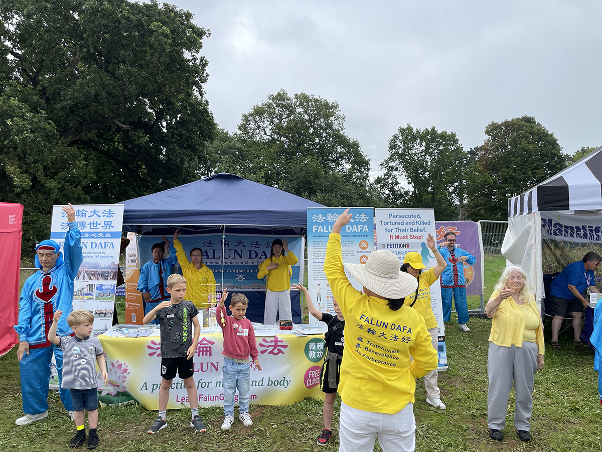 史杜尔德·费尔韦瑟(Steward· Fairweather)和他的三个孩子站在展位前看着学员炼功,因为以前练过其他的冥想方法,他一直对打坐感兴趣。他问孩子们是否想学功,他们都非常愿意尝试,于是学员叫孩子们坐在垫子上,一招一式的教他们功法动作。