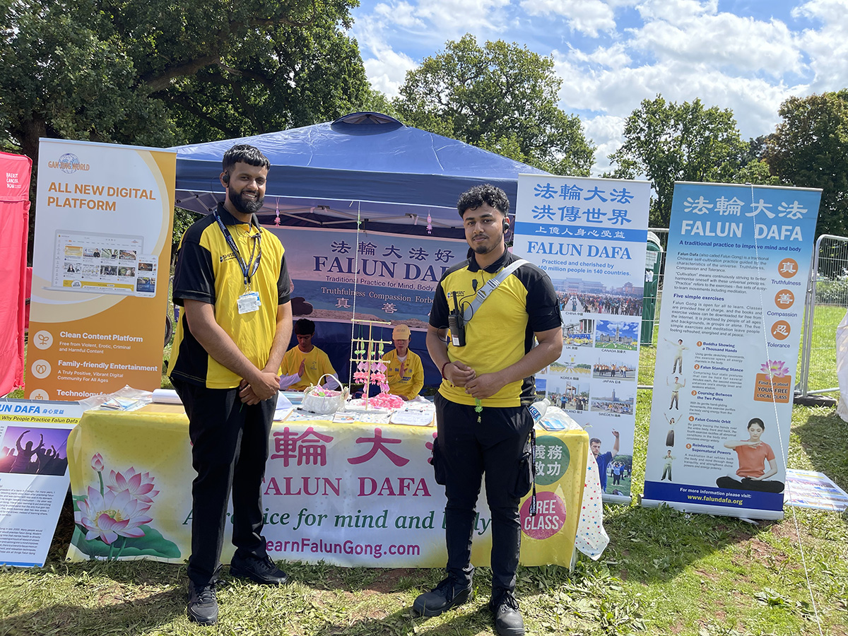 贾米尔(Jamil)是嘉年华会场的保安,他对法轮功学员的展位赞赏有加。他说:“今天我来到法轮大法展位,对中国文化产生了好的印象和体会。我知道中国人遭受着迫害。”他身边的同事也了解维吾尔族人在集中营里受奴役。