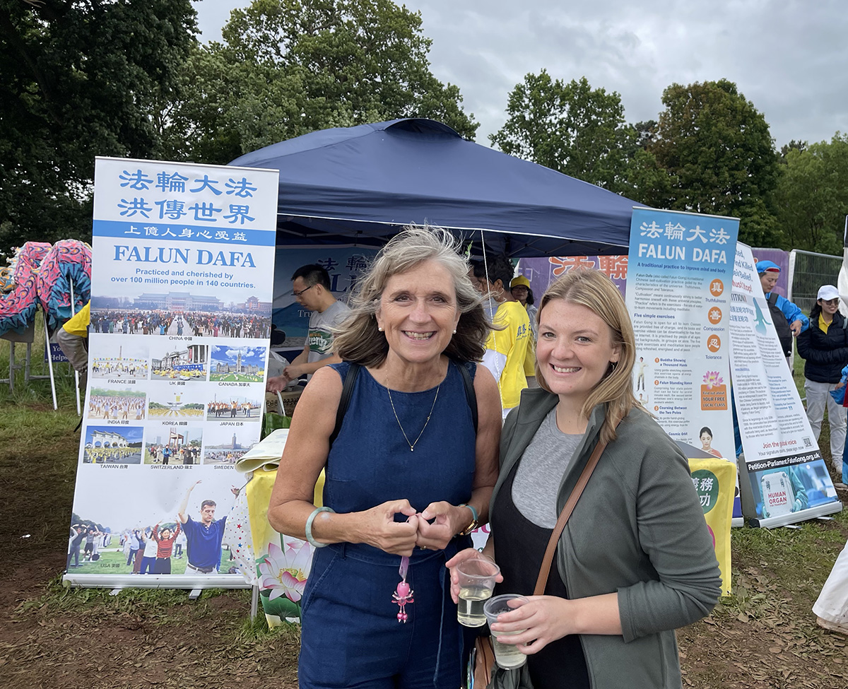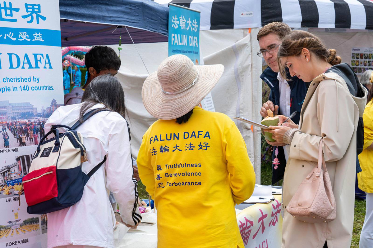 还有一些摊位的工作人员对炼功感兴趣,抽空来了解功法,表达了学功的愿望。他们对学员们做的事情,即反迫害传播真相很敬佩,他们不但签名还叫来同事,有的送给学员甜点吃。