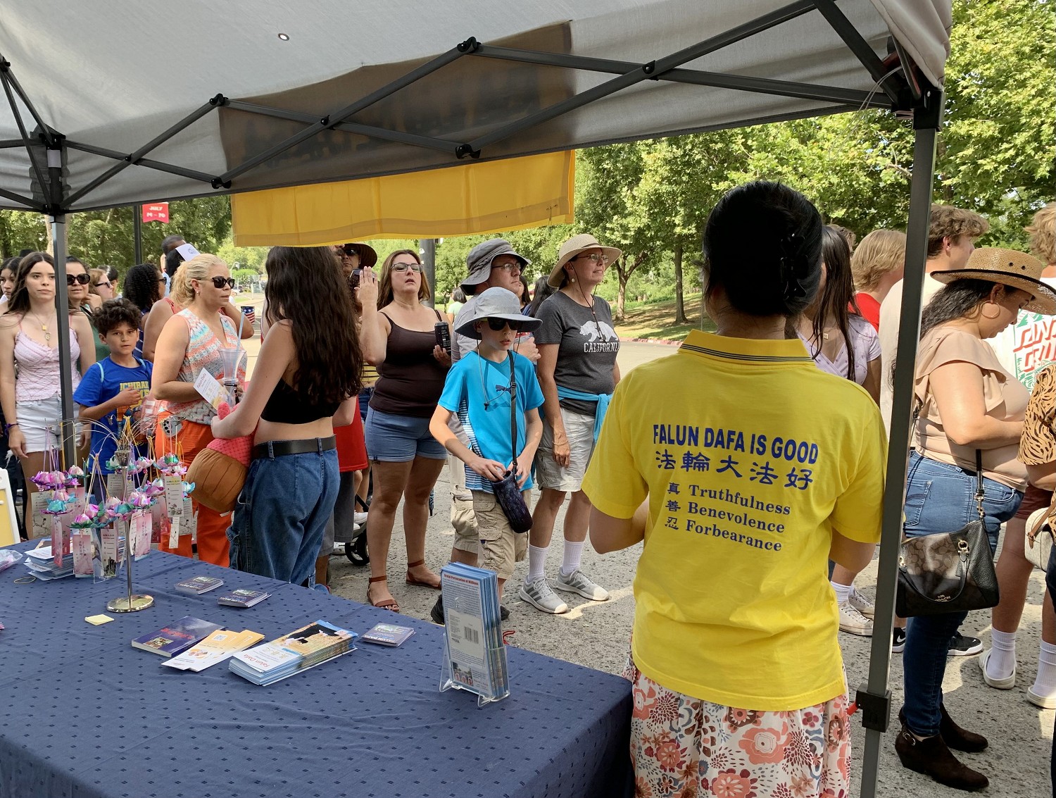 每当游人排队进场的时候,因安检有时需要等待。高温烈日下很多游客还没进场就已显疲惫。除了发送真相资料,学员们也向游客展示五套功法,在祥和宁静的炼功音乐中,吸引很多人驻足观看、聆听,长长的队伍在经过法轮功的展位前安静有序,连小孩也如此。