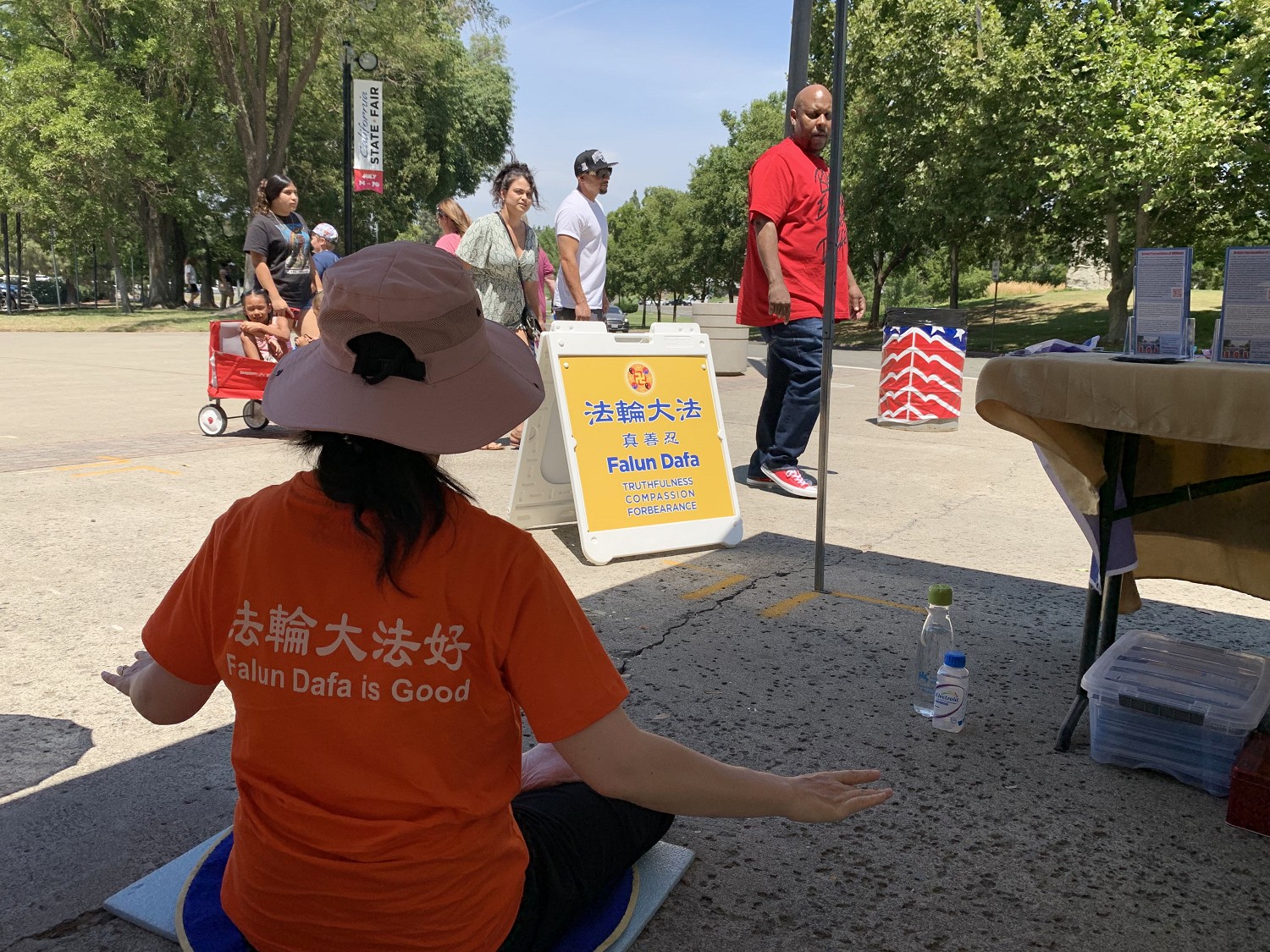 除了疫情期间博览会停办,当地学员每年都被批准在此设立展位已超过二十年。今年持续不下的高温,往年在周末热闹而挤满其他展位的言论自由区,今年却始终只有法轮功一个展位,成了一道独特的风景。