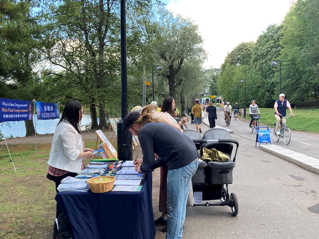 一位路过的芬兰市民向正在发资料的学员竖起大拇指,并用芬兰语说:“法轮大法好!”