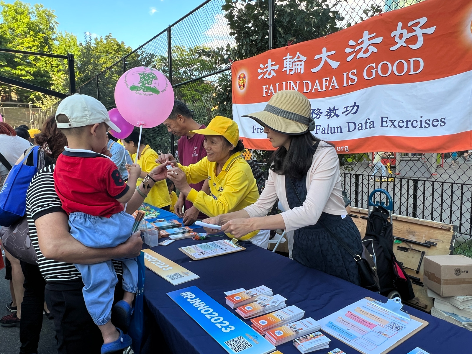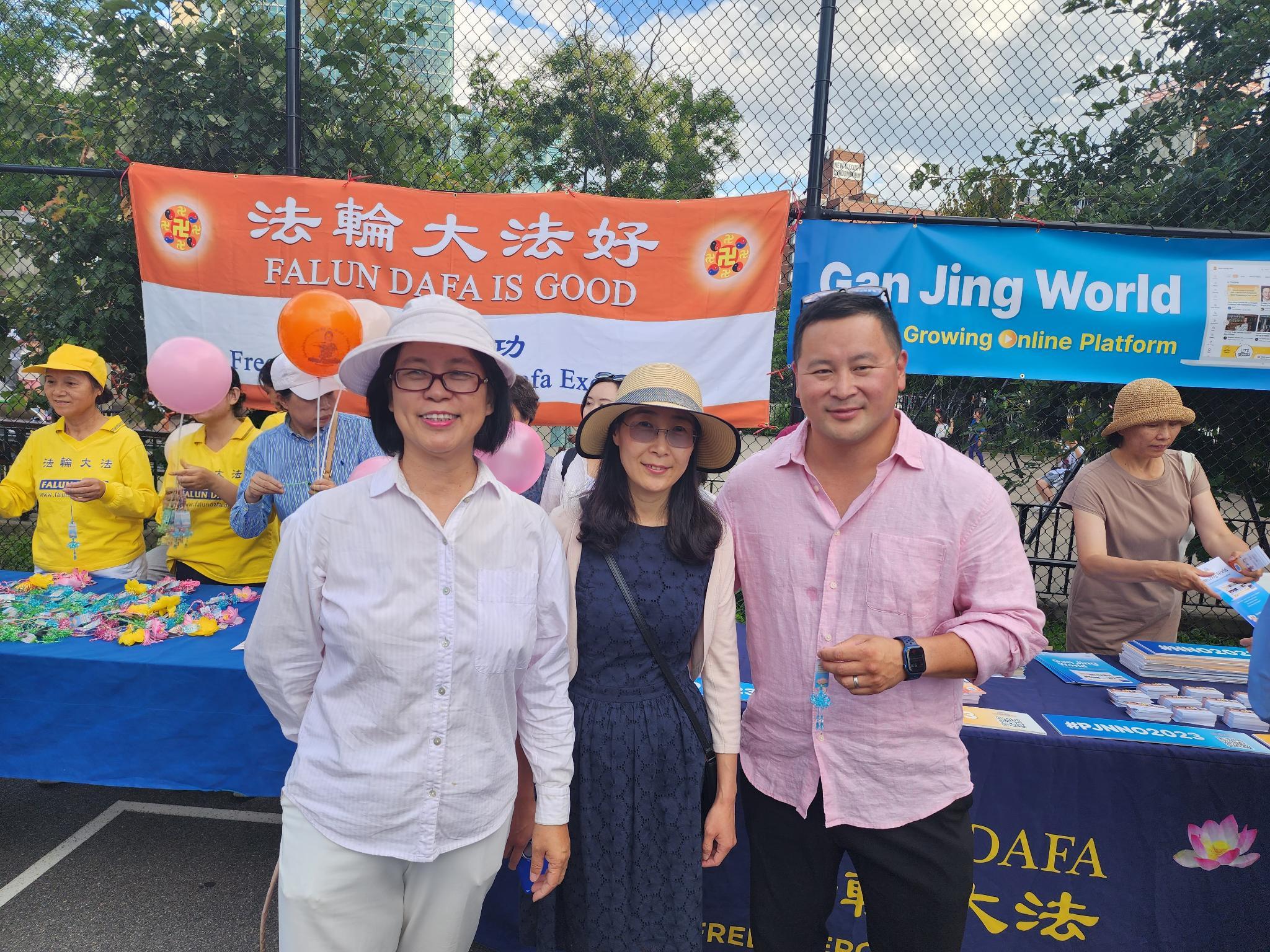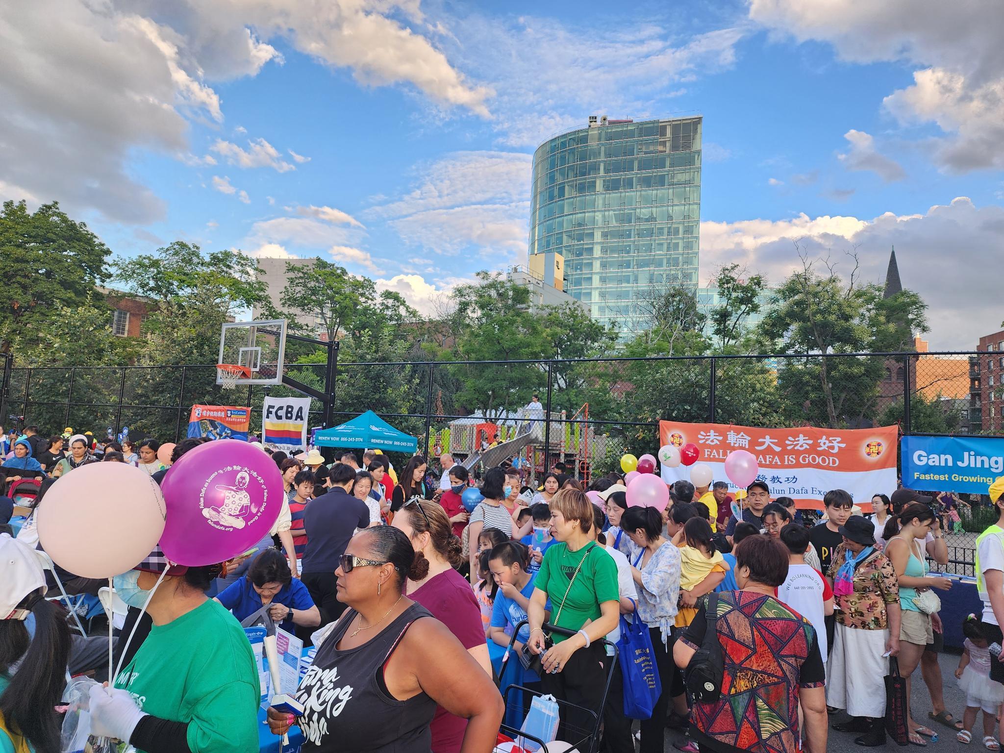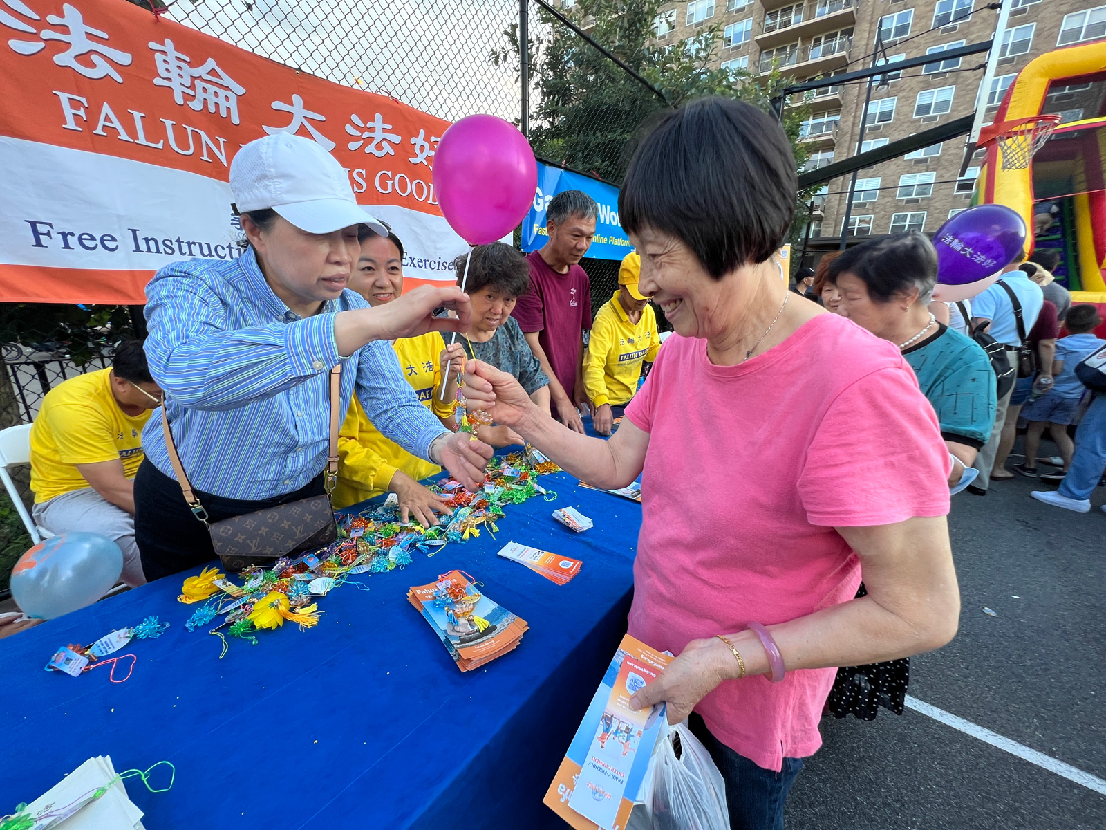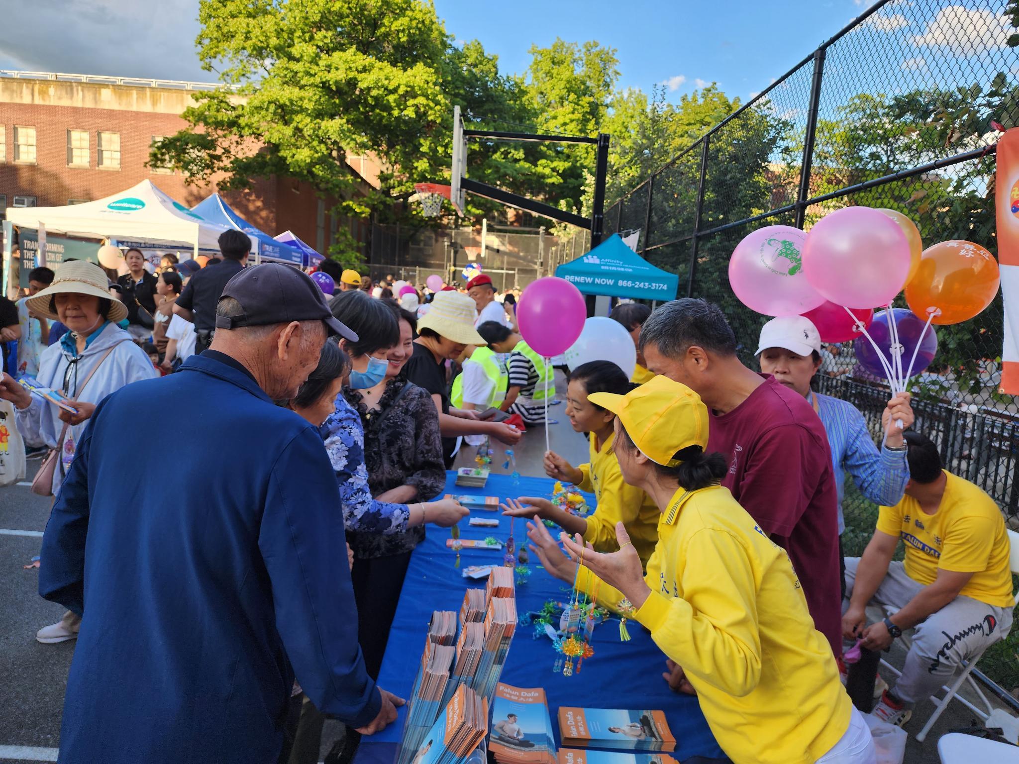 法轮功学员们在热闹的活动现场也摆设了真相摊位,学员们展示五套功法,还向中西族裔的民众派发印有“法轮大法好,真善忍好”的真相小莲花、气球以及介绍法轮功修炼的传单。