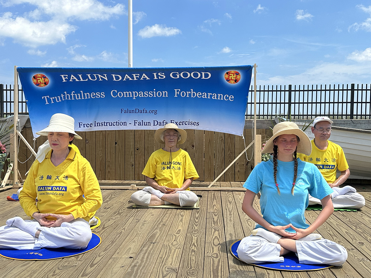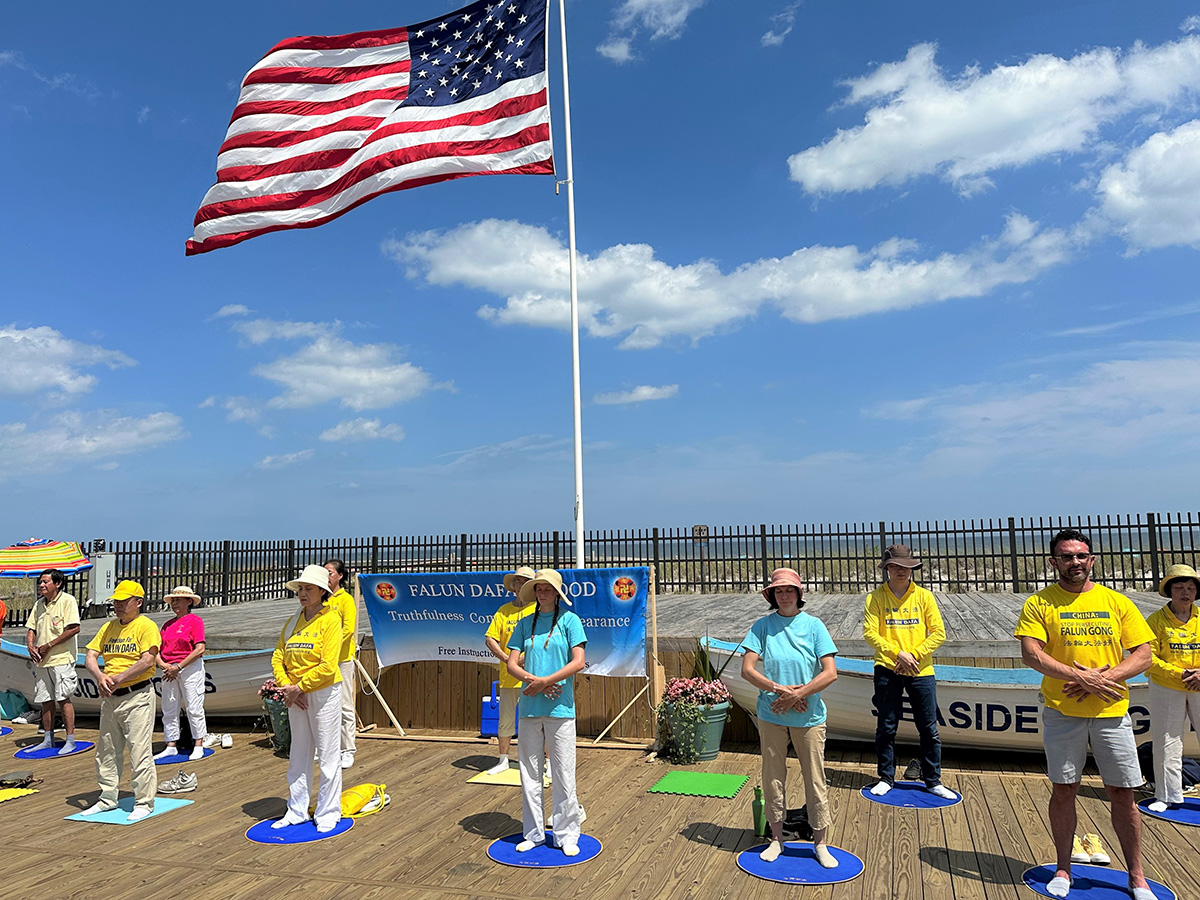 图1~4:新泽西州法轮功学员在海滨高地镇木板路上展示功法。