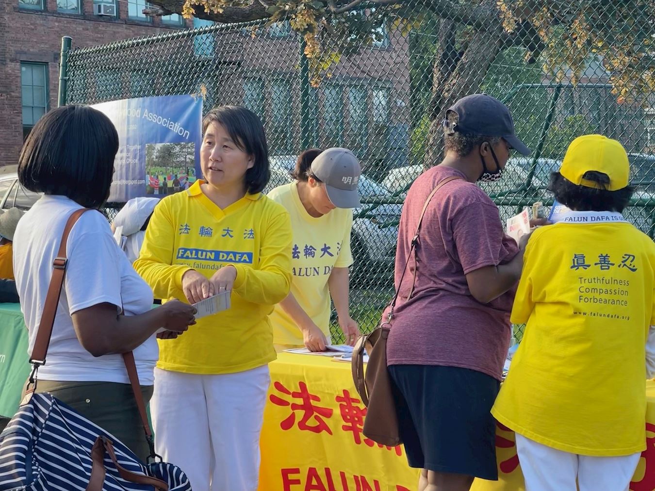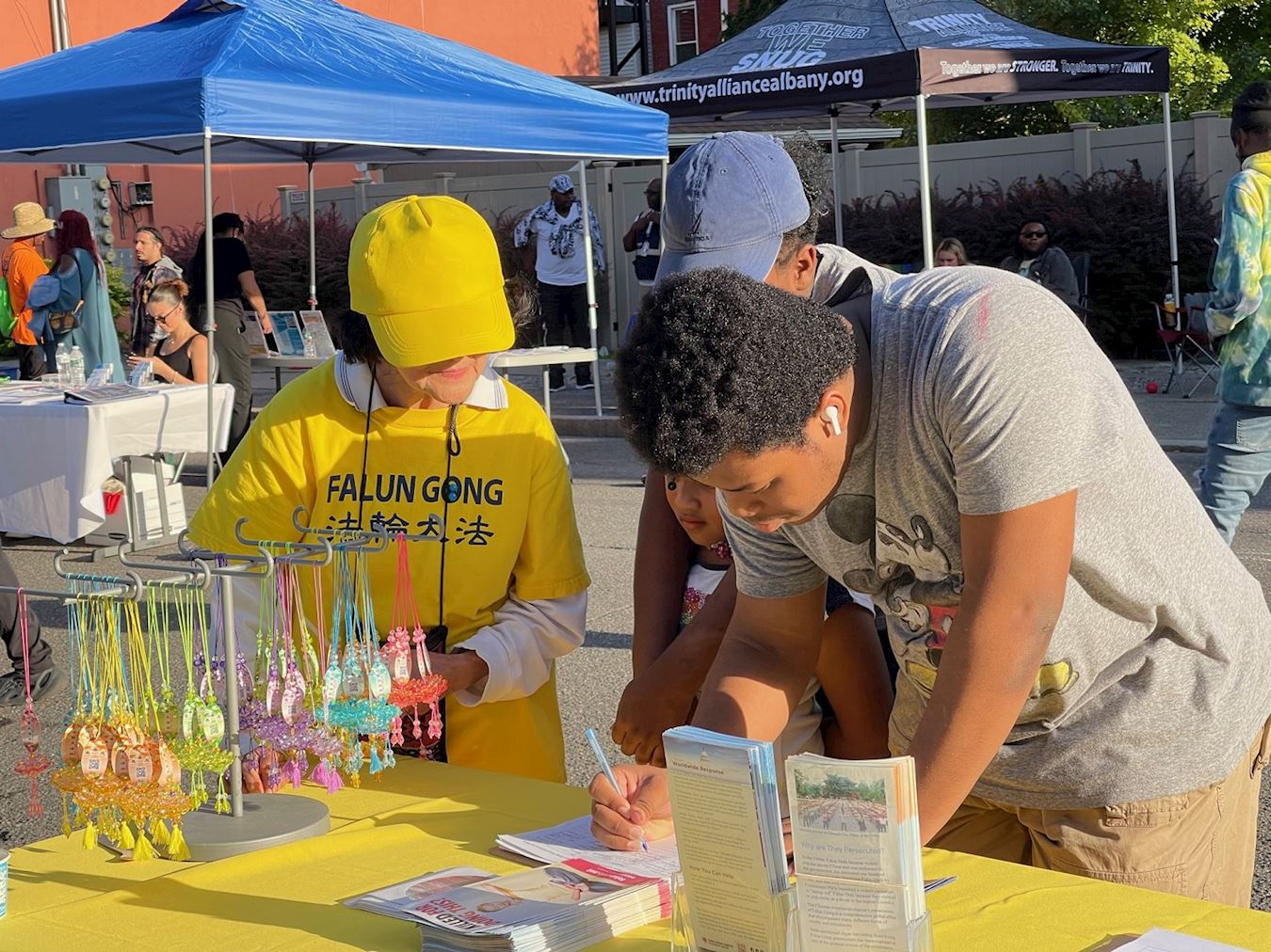 法轮功的展位处在街区的入口处,参观者听了学员们的介绍,明白真相的人们简直不敢相信这样一个有益身心的平和的修炼功法居然在中国被残酷迫害打压了二十四年,至今仍每天发生着法轮功学员被活摘器官的惨案。人们听完真相后纷纷在反迫害请愿书上签了名。
