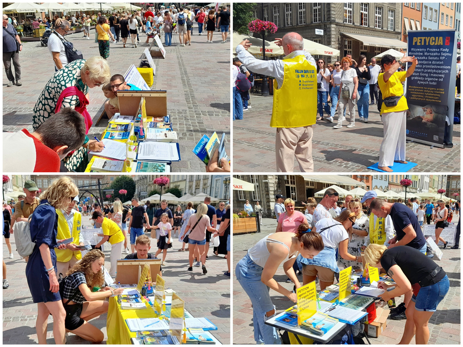 学员们在路中央擺放了一排醒目的海报和横幅,还准备了中、英、德三种语言的真相资料,他们向路人散发真相传单,并请民众在呼吁波兰政府帮助结束中共迫害的请愿书上签名。