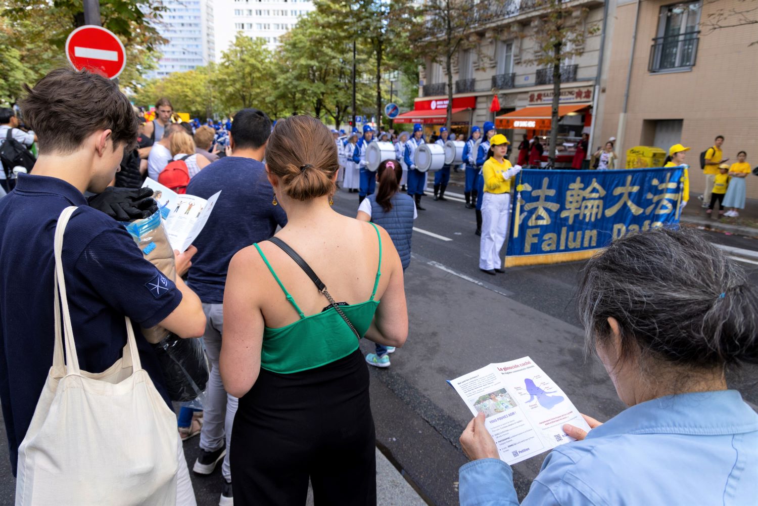 一位六十岁左右的中国男士静静地观看游行。他告诉学员,自己是吉林人,于二零零一年来到巴黎定居。他知道中国媒体曾一度赞扬法轮功,并说自己知道那时(中共迫害法轮功之前)有很多人炼。但他并不清楚为什么中共媒体后来开始污蔑法轮功。
