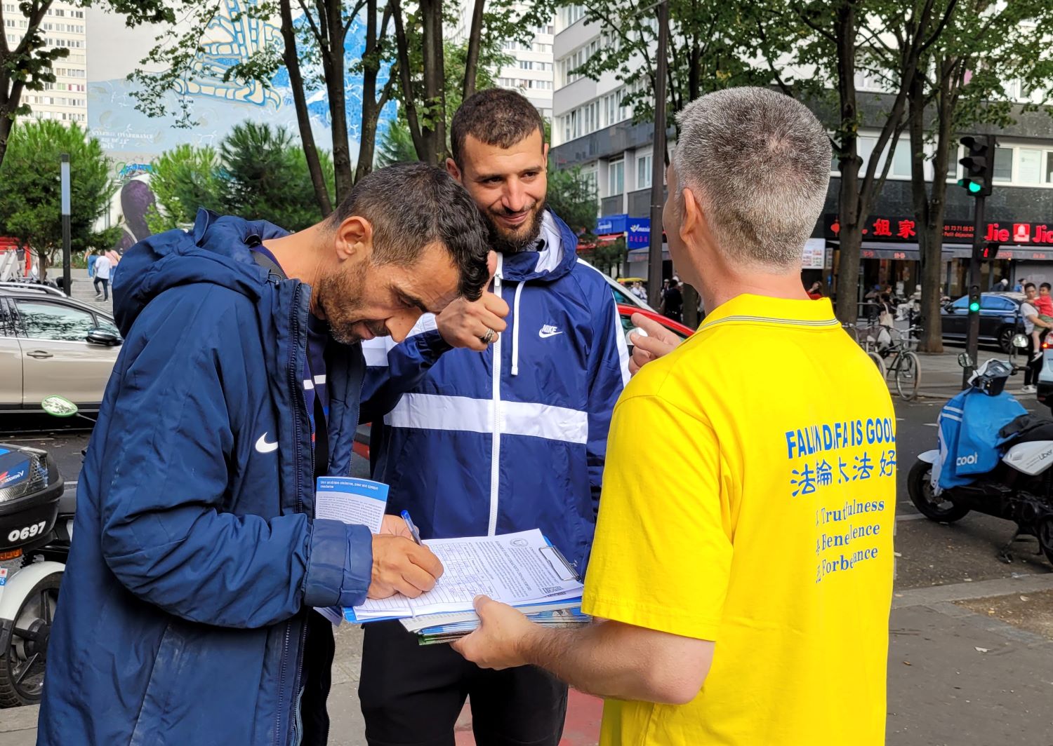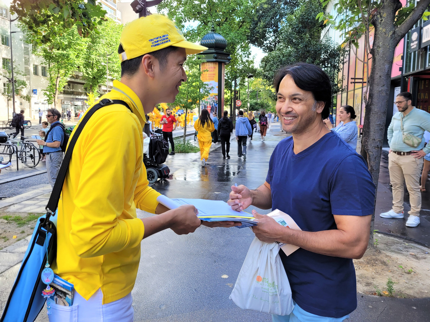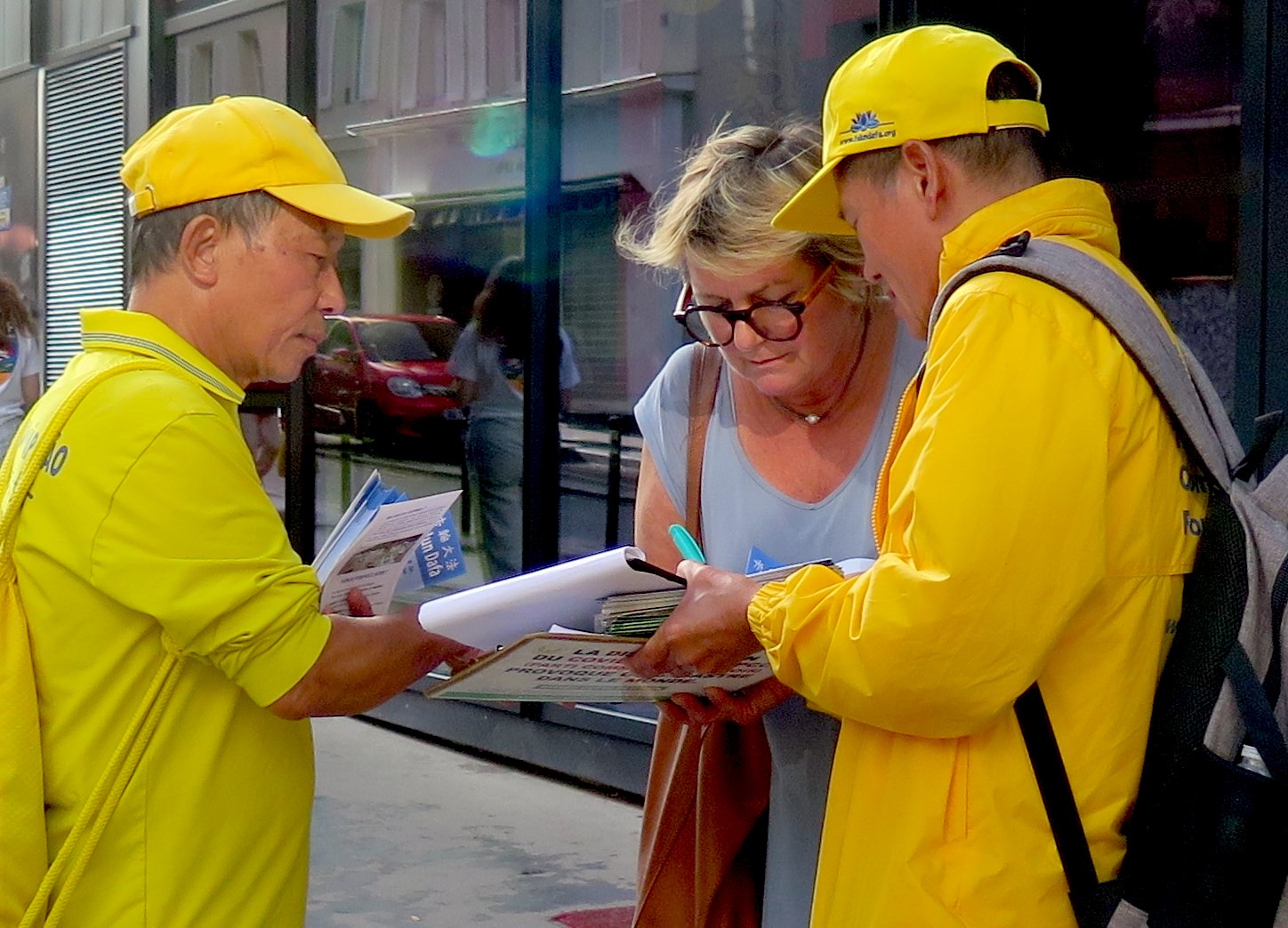 吴先生和太太表示,很多年前就听说过法轮功,也在网上观看过法轮功创始人的教功录像。他们一直想找法轮功的书籍阅读,但苦于不知到哪里去找。他们庆幸自己在这里遇到法轮功,并从学员那里得知、巴黎有一家专营法轮功书籍的天梯书店。
