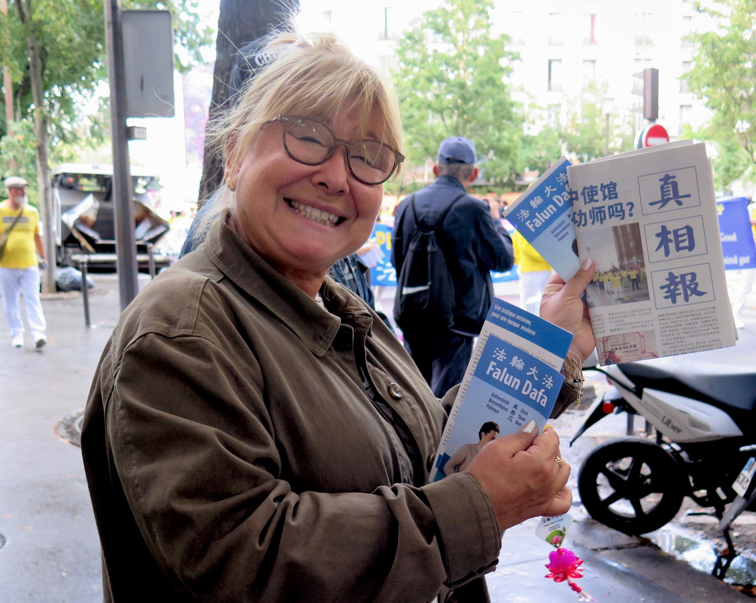 ![]() 图9:瓦莱丽(Valérie)女士看到法轮功学员的游行非常高兴,不仅自己拿了真相资料,还为华人邻居拿了中文的真相资料和一份真相报,要与邻居分享当天的见闻。 |