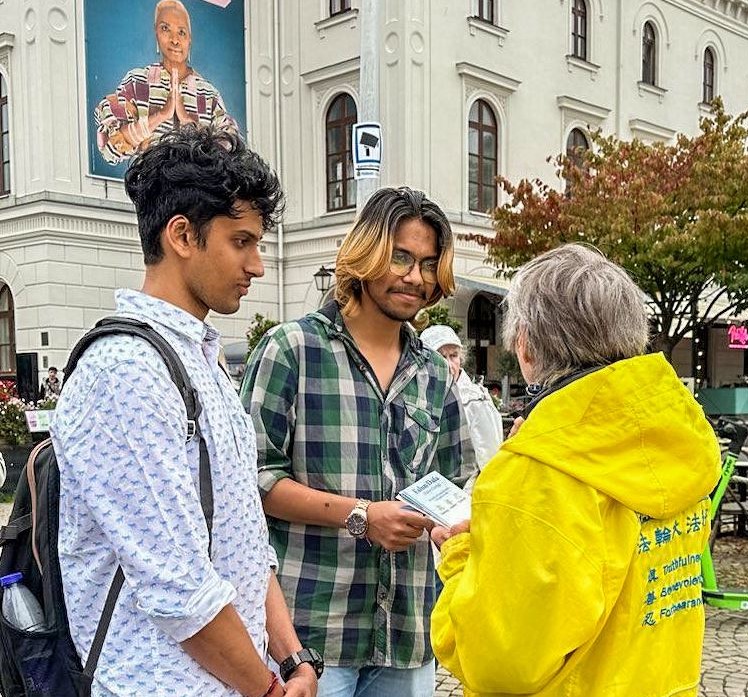 两位女士驻足在法轮功学员面前,仔细地观看法轮功学员们展示的功法。当他们得知法轮功可以使炼功人达到身心健康,并找到内心的平静时,她们异口同声地说:“这很适合我呀!”很巧的是,她们住的地方离其中一个炼功点不远,她们表示会去学功。通过与学员的交谈,她们了解了法轮功,同时也了解了中共迫害法轮功的真相。