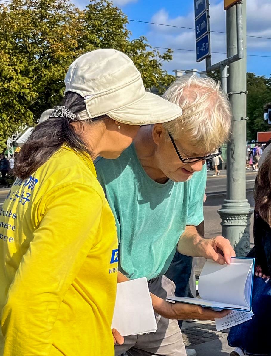 一位七十多岁的瑞典老先生站在法轮功信息台前东看看西看看,手里已经拿了几份不同的传单。当他看到在一旁展示的大法书后,马上拿到手里翻阅起来。一位法轮功学员走上前去问他是否了解法轮功,他回答说了解一点。然后他就直接对学员说:“我要买这两本书。”