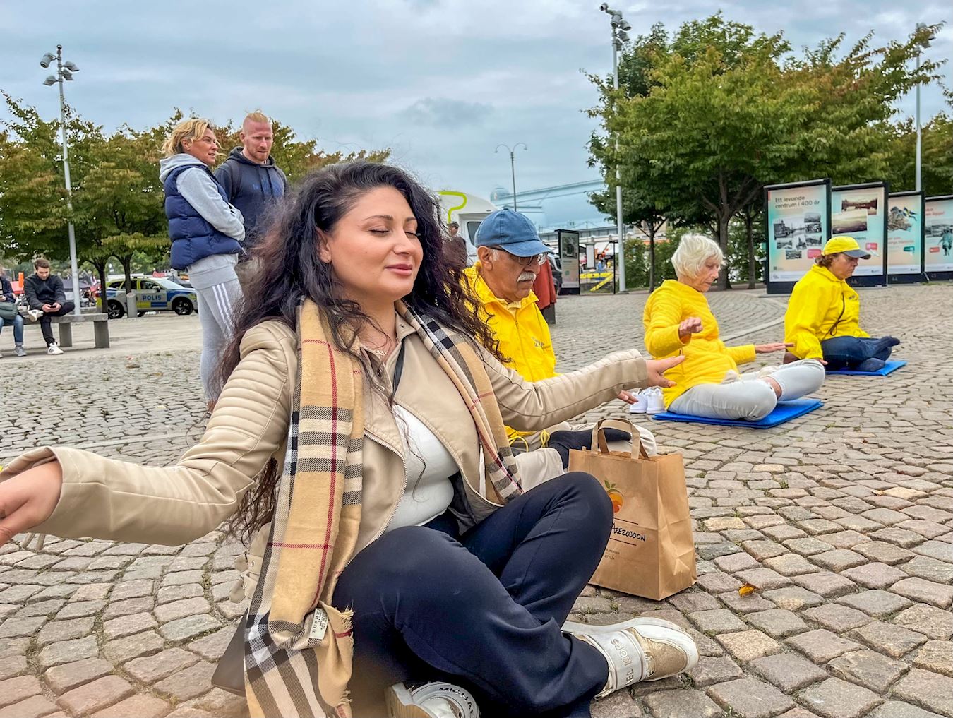 来瑞典旅游的尤瑟夫(Yusuf)是一位高大英俊的中年人,能说一口流利的中文。他面带笑容的看了一会法轮功学员们的功法展示,然后他对在一旁发传单的法轮功学员说:“我喜欢法轮功。”