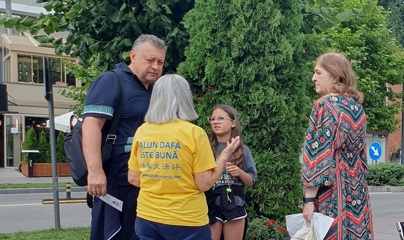 杜米特拉什库(Dumitrașcu)太太已经退休,她和丈夫在真相展位前停下脚步。当听说学员们努力遵循真、善、忍的原则修炼时,她对法轮功学员提醒人们要提升和尊重道德的做法表示赞同,因为这是正确的,是为了人类的幸福。