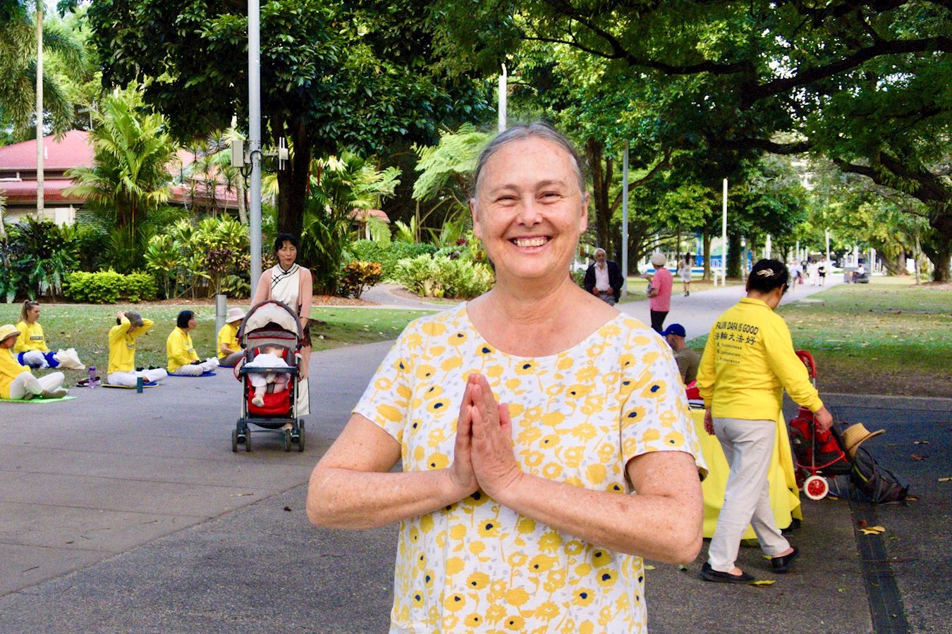八月二十五日傍晚,在凯恩斯滨海艺术中心,做治疗师和辅导员工作的英国游客安娜(Anna S)感受到法轮功学员展示功法的祥和能量,她对法轮功产生了极大兴趣。她在展位前与法轮功学员交谈许久,她了解了很多有关法轮功的真相,还学炼了五套功法。