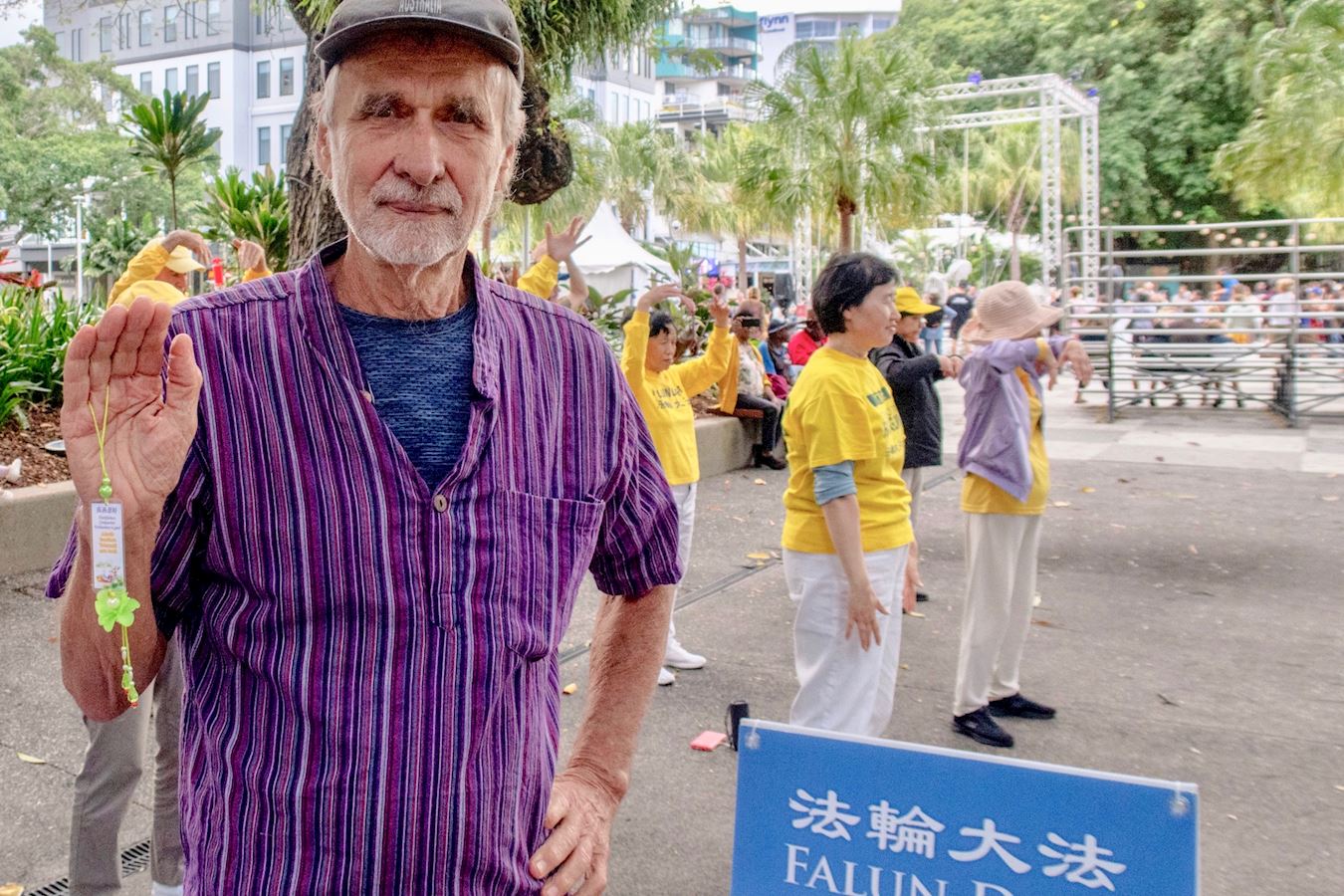 来自维多利亚的马修(Matthew M)注意到了在凯恩斯滨海大道上的法轮功活动现场,他前来了解法轮功真相,他说:“当我走过来时,我能感受到法轮功学员身上散发出的纯正能量,就情不自禁地也融入到这美妙的能量场里了。”