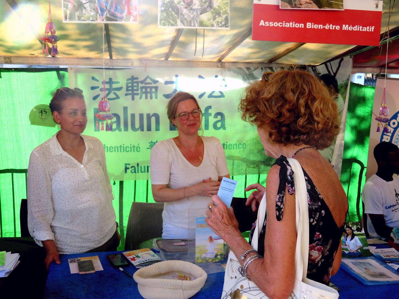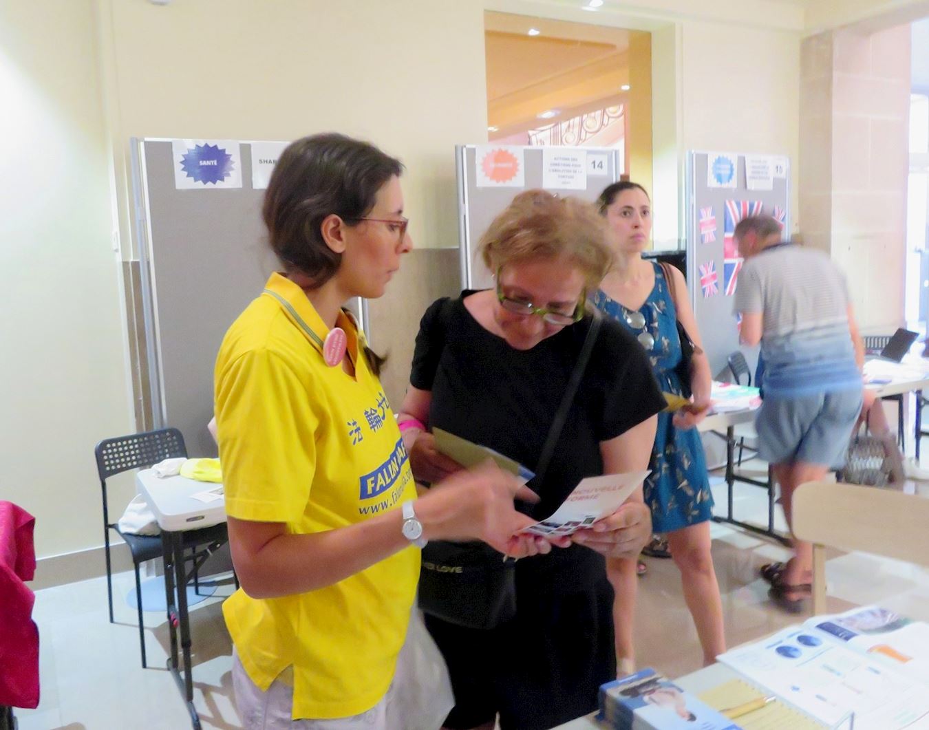 原籍马拉喀什(Marrakech)的米莉亚姆(Myriam)女士,她告诉学员,很久以来她就在寻找一种修炼方法,现在终于找到了,她对修炼法轮功有极大的兴趣,她感到自己现在非常需要修炼。与在场的法轮功学员交换了手机号码,她还向学员询问巴黎炼功点的信息。