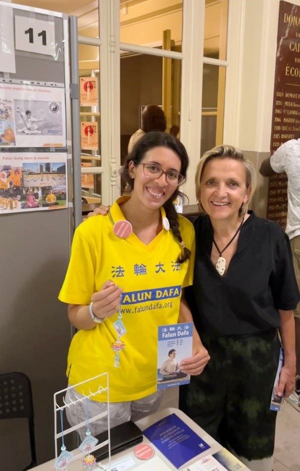 巴黎第五区区长弗洛兰斯·贝尔托(Florence Berthout)女士来到法轮功展台前停留了几分钟,愉快地与法轮功学员交谈。法轮功学员向她介绍真、善、忍修炼原则,她接受了学员送的印有“法轮大法好”的小莲花。她将莲花戴在手腕上,并告诉法轮功学员,她来到了论坛最好的地方,也是酷暑中最凉爽的地方。