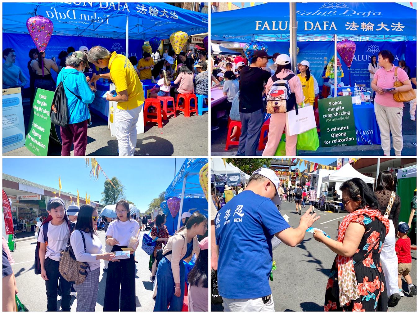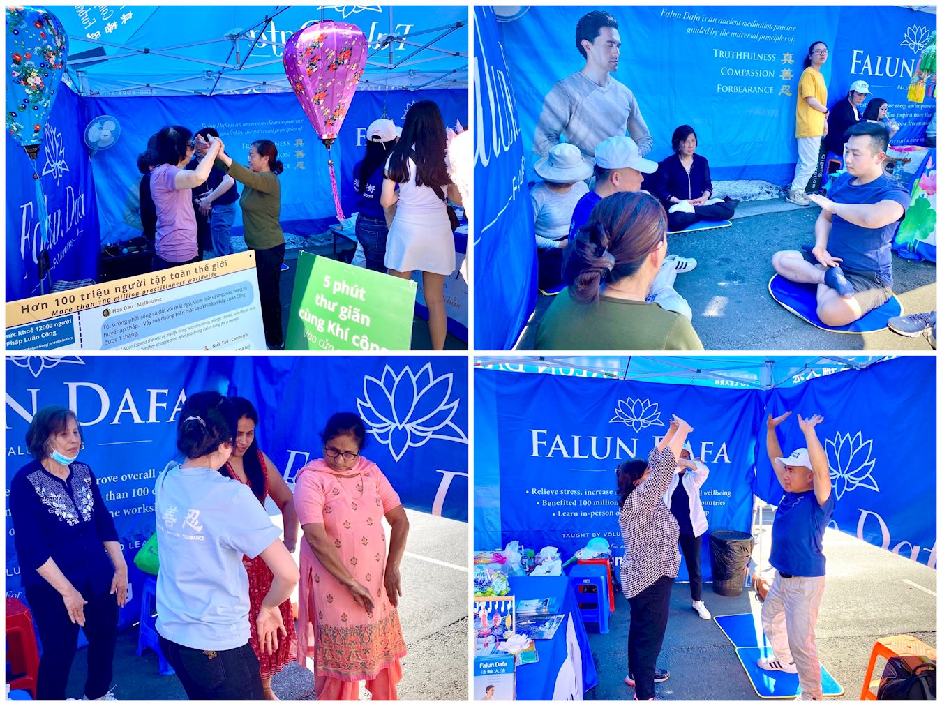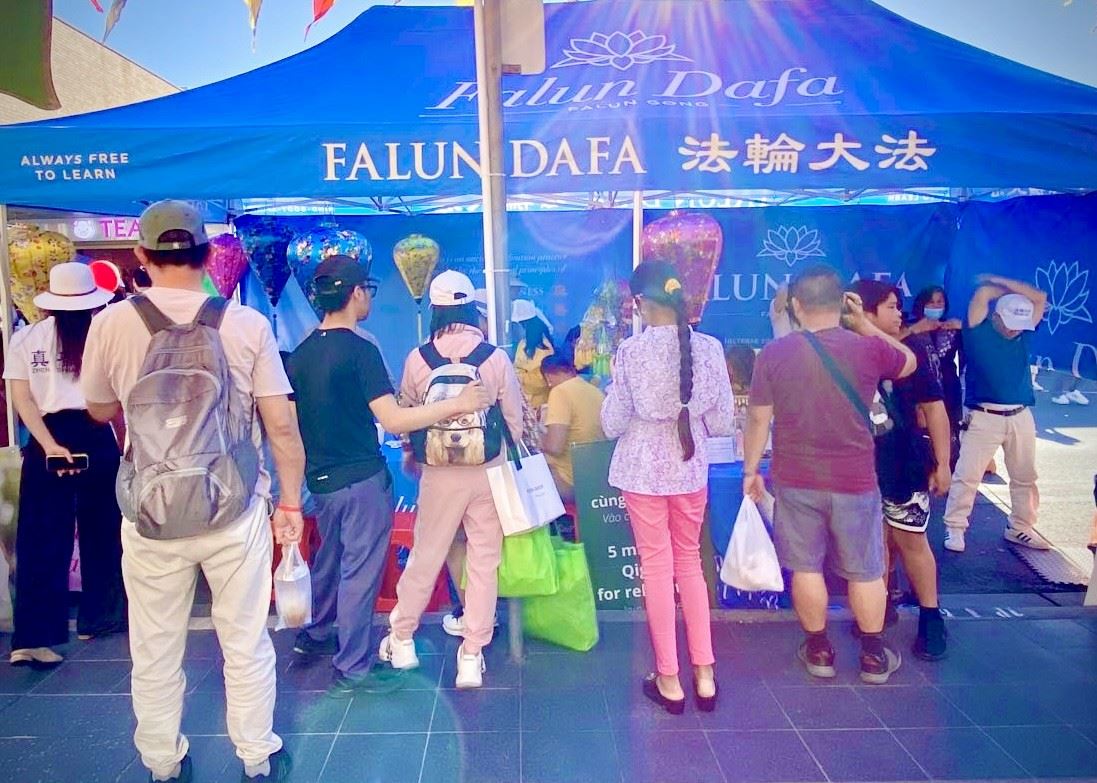 中秋佳节庆祝活动期间有丰富的娱乐活动,如美食、市场展位、音乐表演和传统舞狮等,吸引了八万民众参加。络绎不绝的民众被宁静祥和的法轮功炼功音乐和美丽舒展的五套功法所吸引。也有很多人是第一次尝试炼功,他们感受到祥和与放松的纯正能量,立刻就喜欢上了,希望学习和了解更多的有关法轮功的修炼理念。