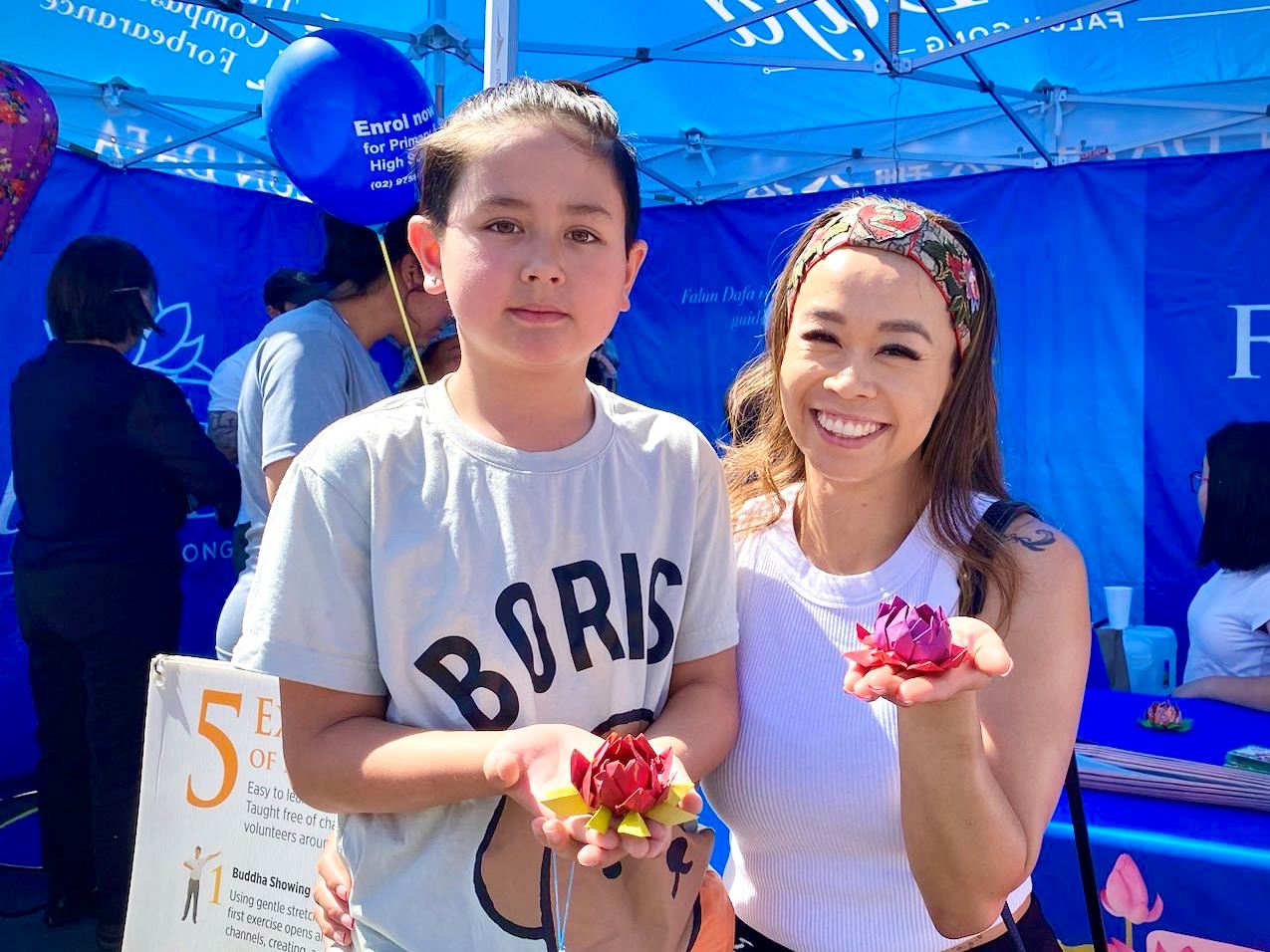 法轮功展位从早到晚都很热闹,有的学员向人们介绍法轮功法,也有学员教家长和孩子们折莲花。在折莲花的时候,学员向孩子和家长们介绍真、善、忍的价值理念,以及对日常生活的重要影响。
