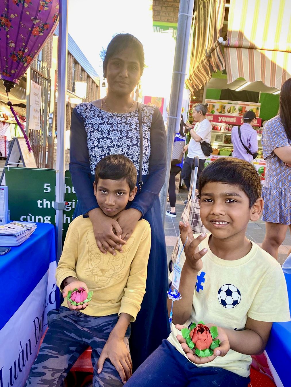 她的母亲说:“我觉得孩子们完全投入到了与法轮功学员互动学习如何使用和制作莲花的过程中了。尤其是我的女儿,她们非常喜欢艺术和手工。因此,让她们坐下来听讲,让她们了解一步步的制作过程,是一件非常有价值的事情。”