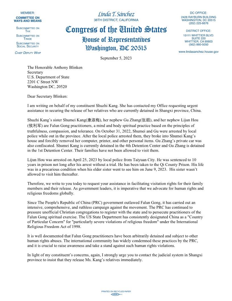 代表加州第38国会选区的桑切斯在信中表示,洛杉矶居民、法轮功学员康女士(Karen Kang)与她办公室联系,希望帮助营救她的妹妹康淑梅、外甥张嘏和侯利军——三人仅仅因修炼法轮功遭到中共迫害,至今仍被非法关押在山西省的看守所和监狱,家人无法探视。