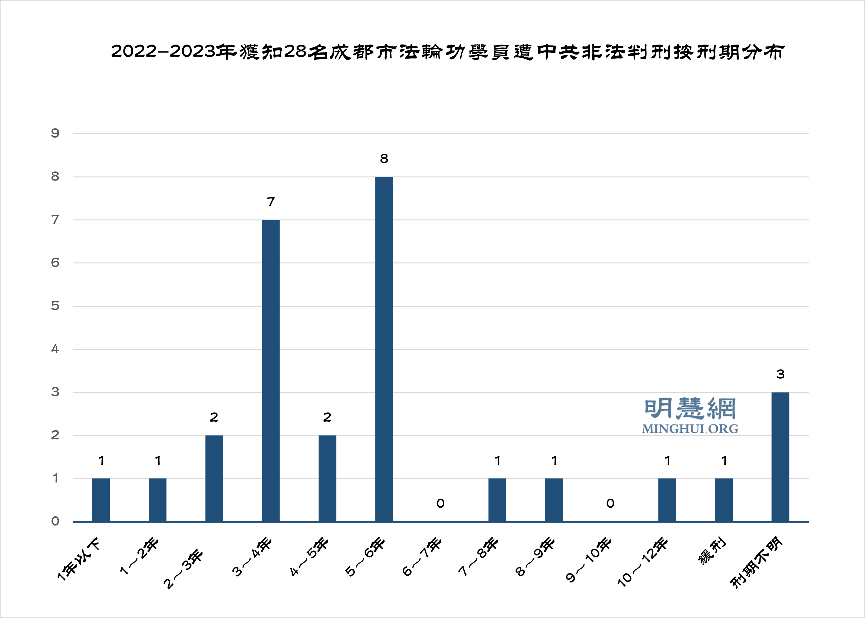 ![]() 图2:2022-2023年获知28名成都市法轮功学员遭中共非法判刑按刑期分布 |