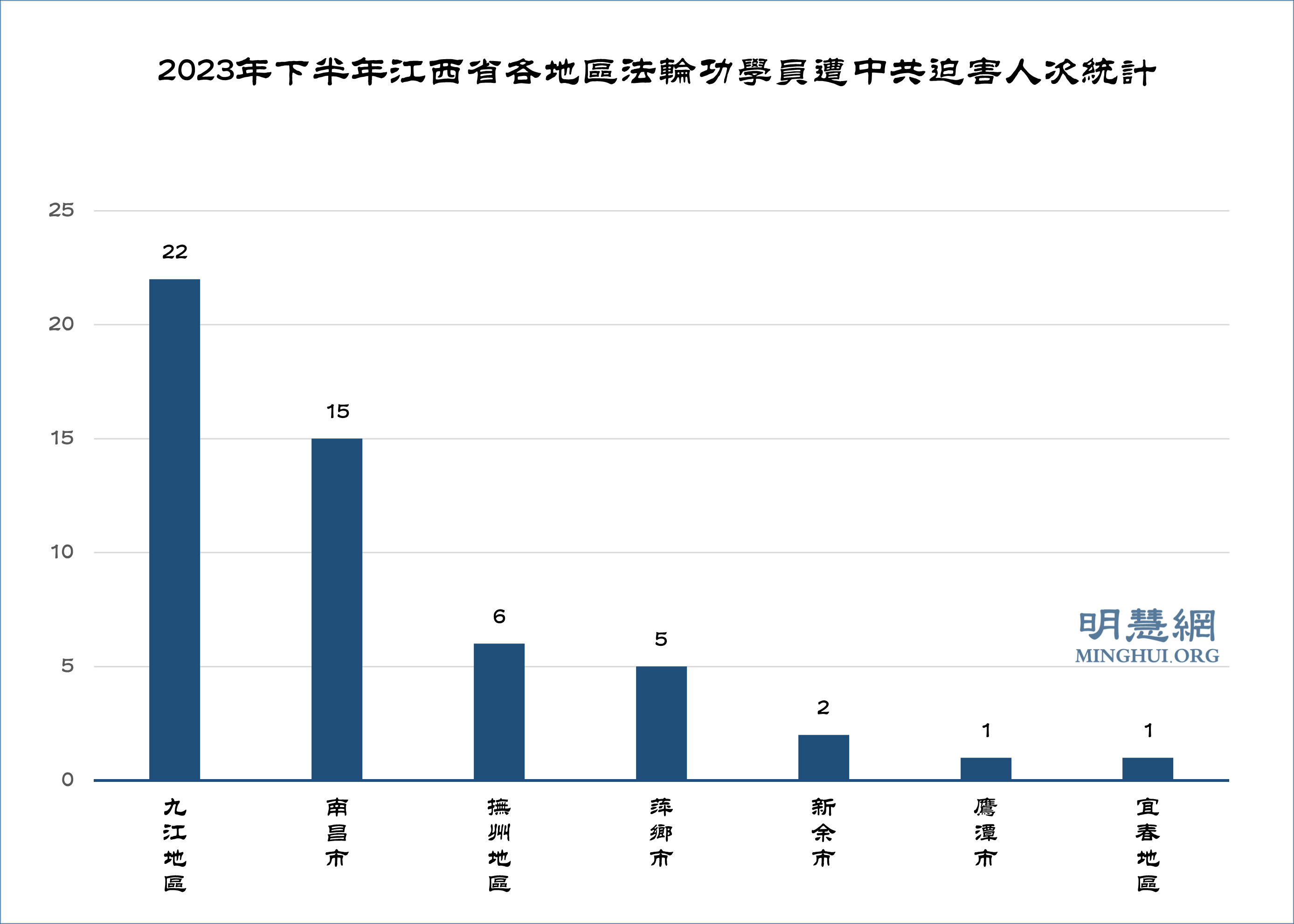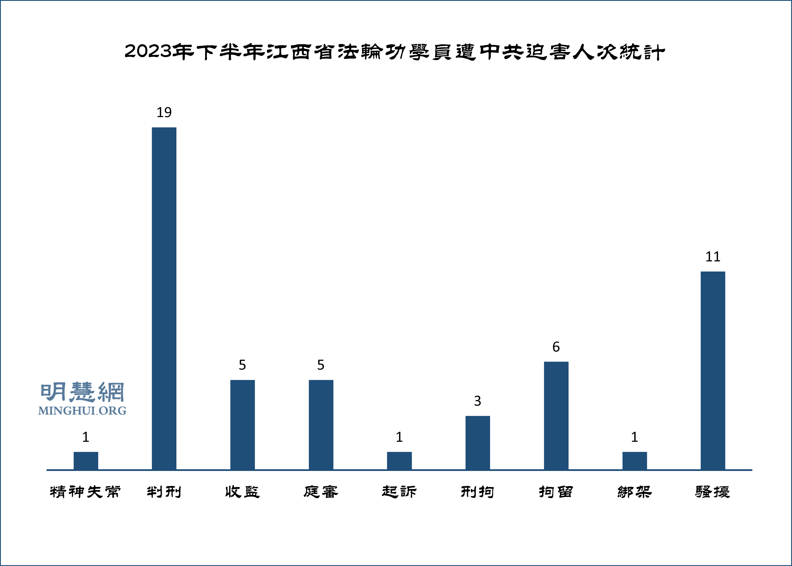 【明慧网二零二四年一月二十九日】(明慧网通讯员江西报道)据明慧网报道统计,二零二三年下半年,江西省法轮功学员被迫害累计52人次,其中:被迫害精神失常1人、非法判刑19人、非法收监5人、非法庭审5人、非法起诉1人、非法刑拘3人、非法拘留6人、骚扰11人等。由于中共迫害导致信息不畅,有些迫害没能及时报道出来,以上统计为不完全统计。目前获知,二零二三年全年中,江西省法轮功学员累计被迫害99人次。