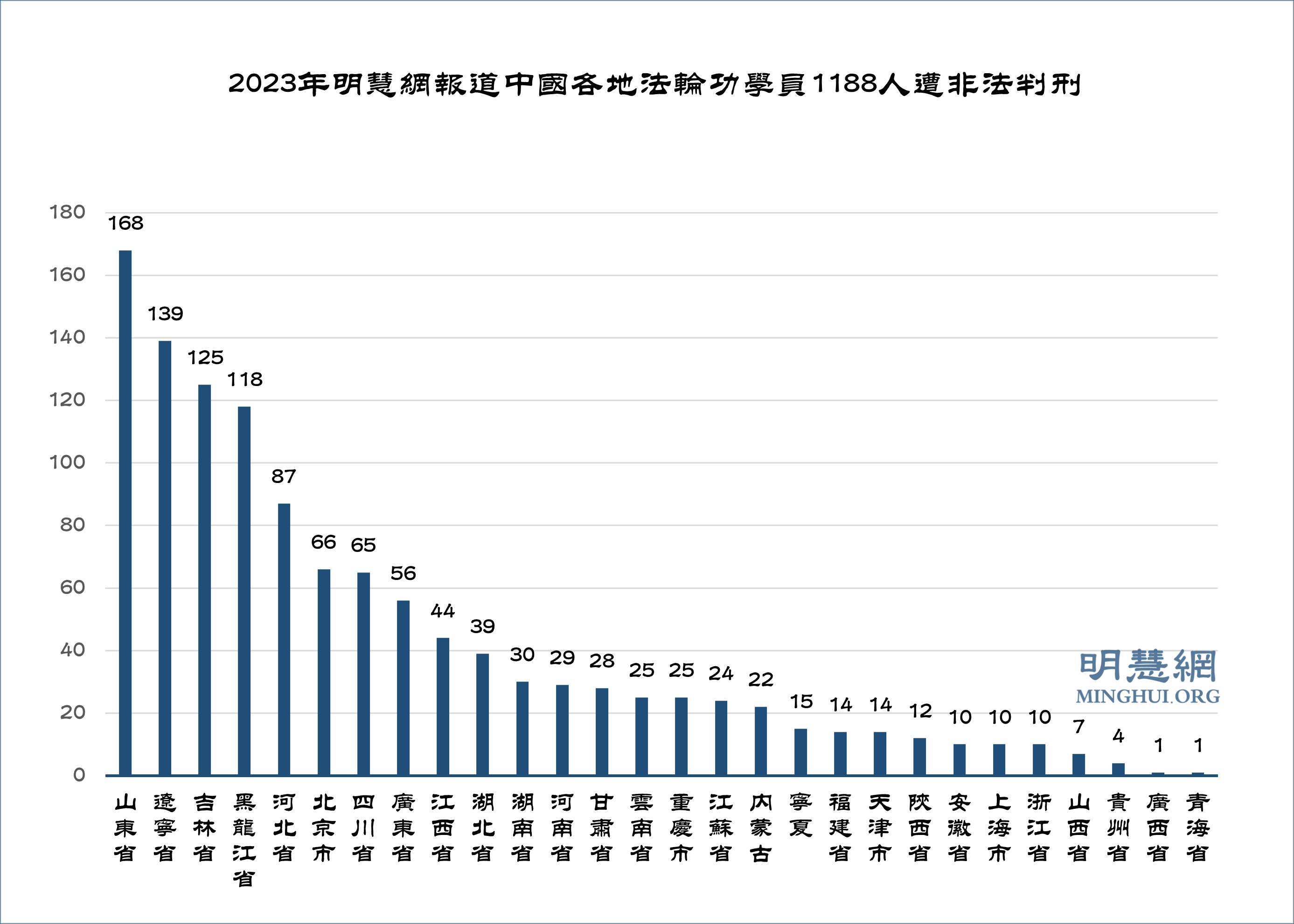 图2:2023年明慧网报道中国各地法轮功学员1188人遭非法判刑