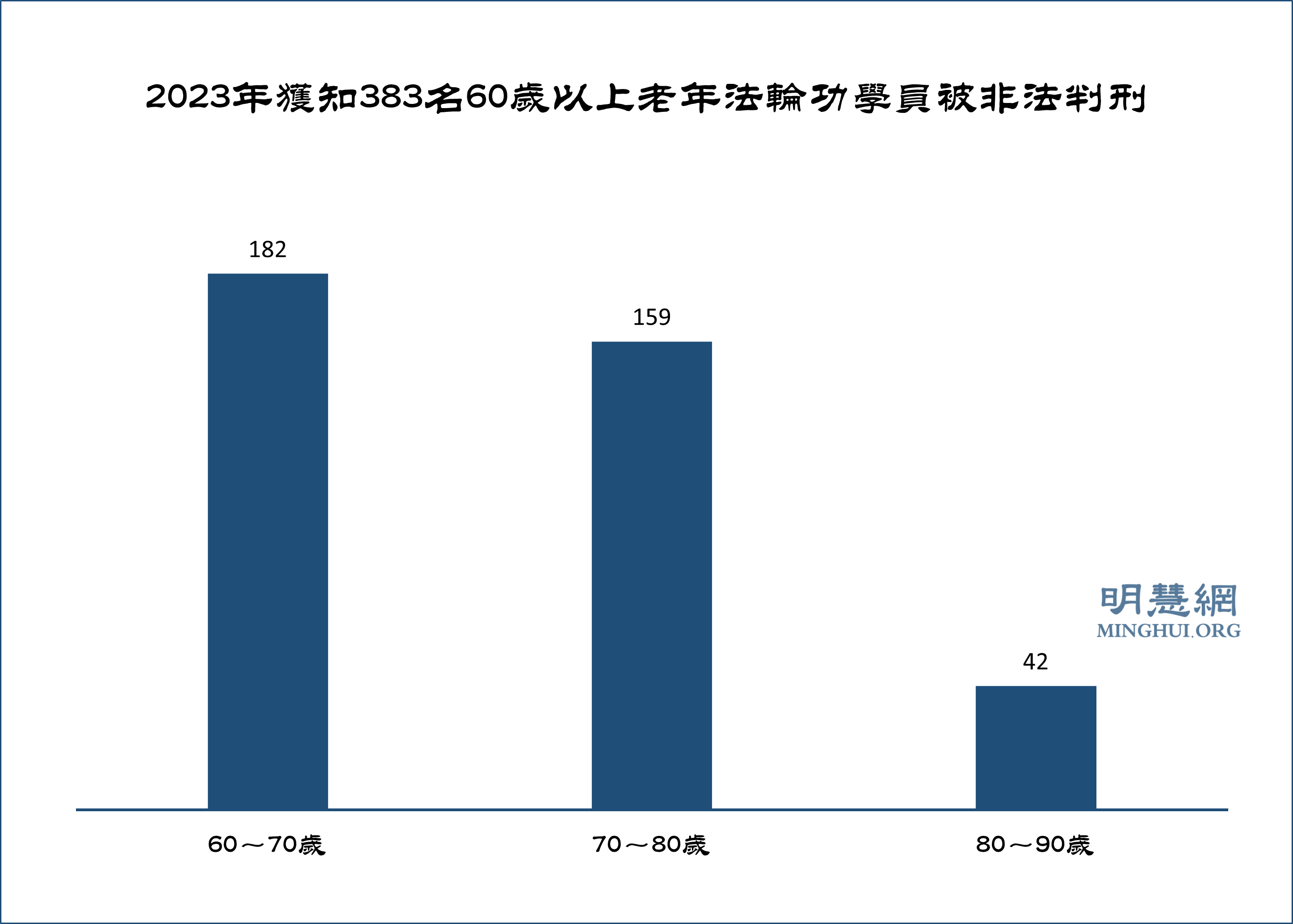 据明慧网报道统计,二零二三年有383名60岁以上老年法轮功学员被非法判刑。其中,80~90岁42人,70~80岁159人,60~70岁182人。年龄最长者89岁。