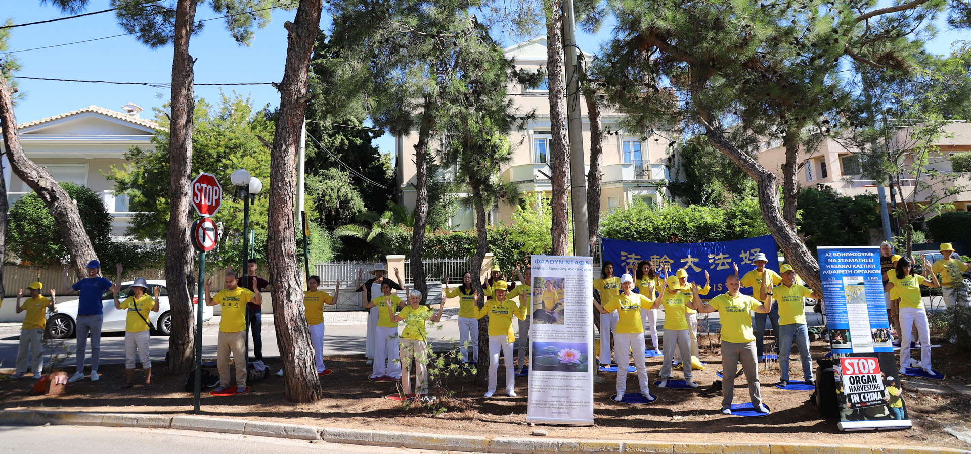 一位希腊女士停车浏览了展板内容,在发传单的学员面前再次停车接过传单,并大声说:“他们(中共)应停止迫害!我支持你们。”